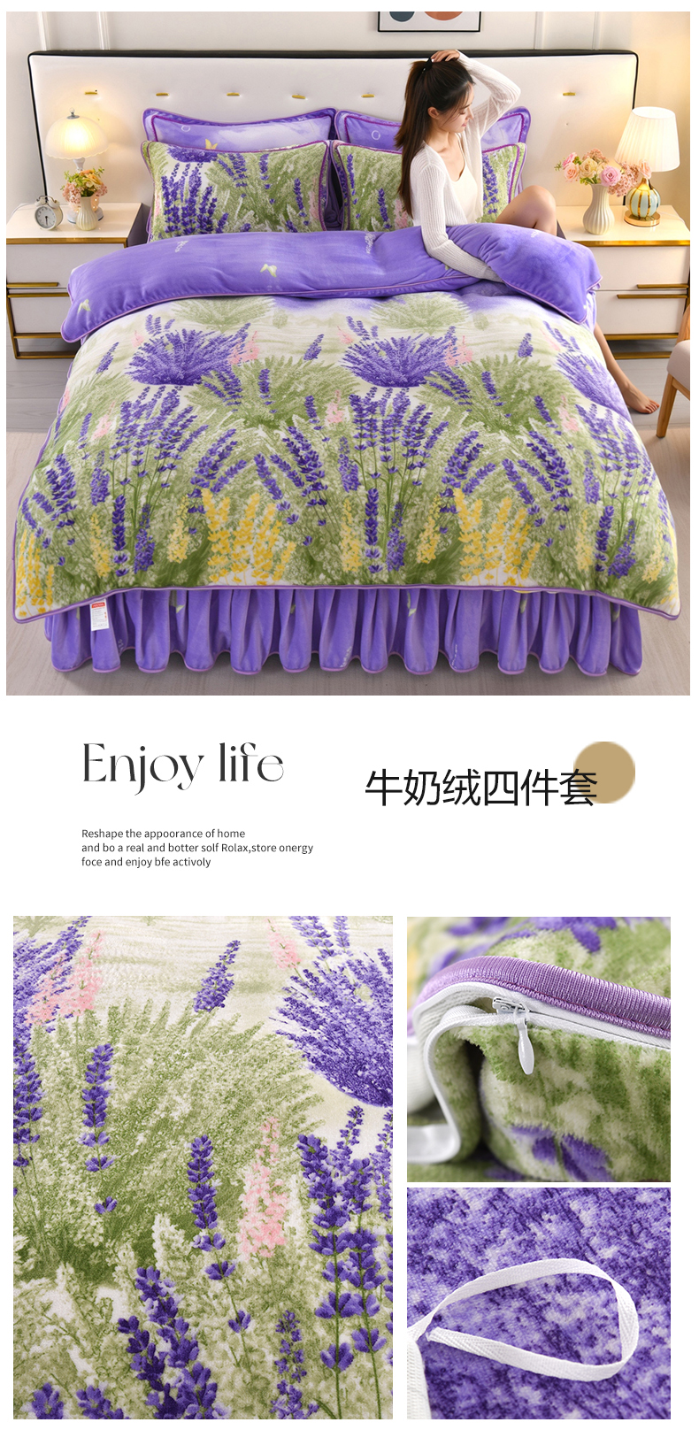 商品名称:绒品壹家 2025新款电商直播爆款高克重7斤牛奶绒金貂绒印花床裙款三件套四件套 薰衣草