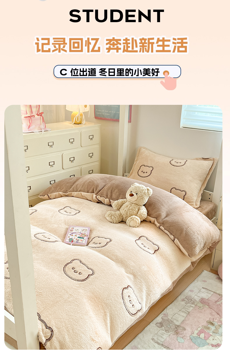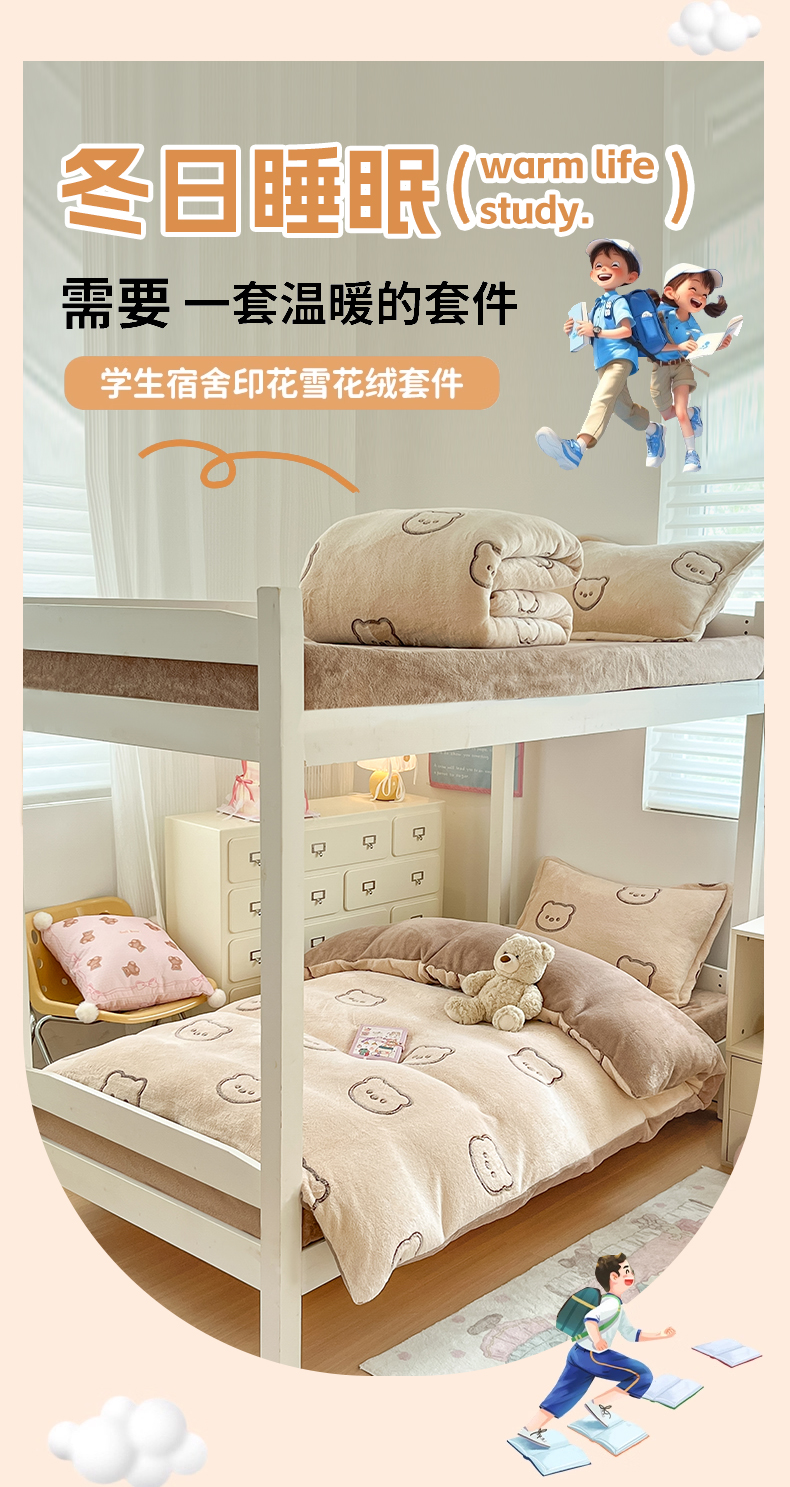 当前位置: 91家纺网 > 商品网购 > 床品套件 > 四件套 > 其它四件套 > 川悦生活 2025新款立体雪花绒印花四件套学生床系列二场景一 曲奇小熊