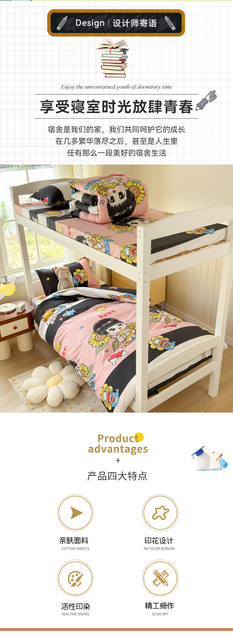 当前位置: 91家纺网 > 商品网购 > 床品套件 > 四件套 > 其它四件套 > 乐居坊 2025新款开学季亲肤棉透气印花芦荟棉四件套(宿舍床) 火力全开