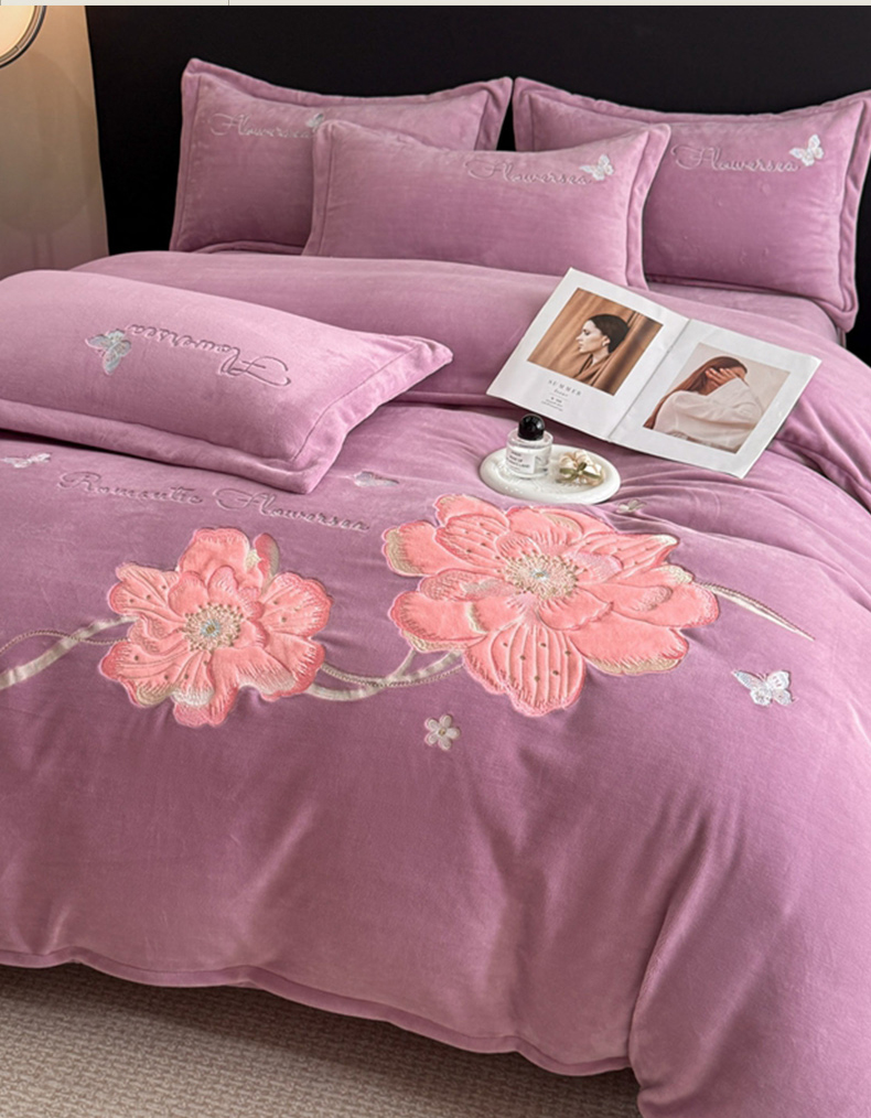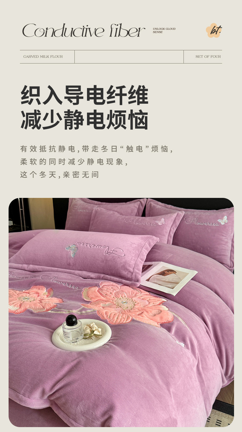 喜梦缘家纺 2025新款牛奶绒大版贴布绣四件套 富贵花开-熏衣紫