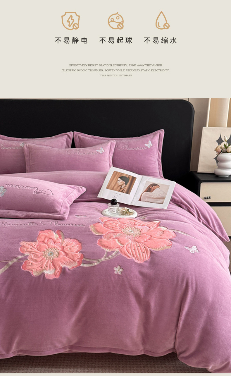 商品名称:喜梦缘家纺 2025新款牛奶绒大版贴布绣四件套 富贵花开-熏衣紫