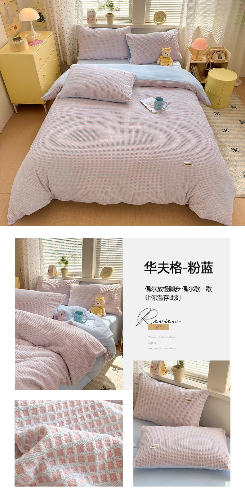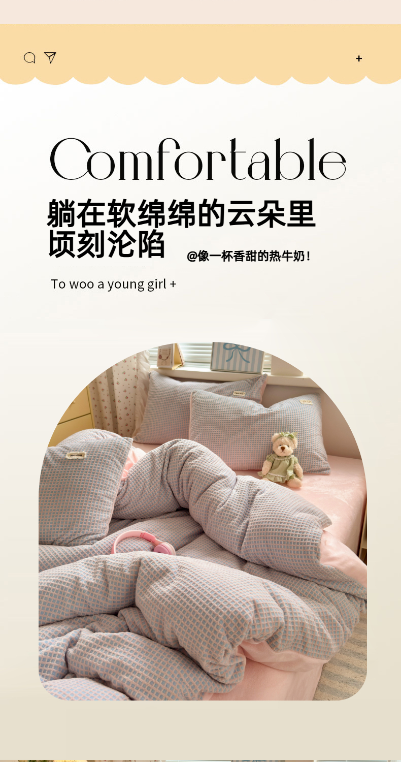 当前位置: 91家纺网 > 商品网购 > 床品套件 > 四件套 > 牛奶绒四件套 > 十里居 2025新款lns奶油双拼华夫格烂花牛奶绒四件套 华夫格系列 华夫格-紫粉