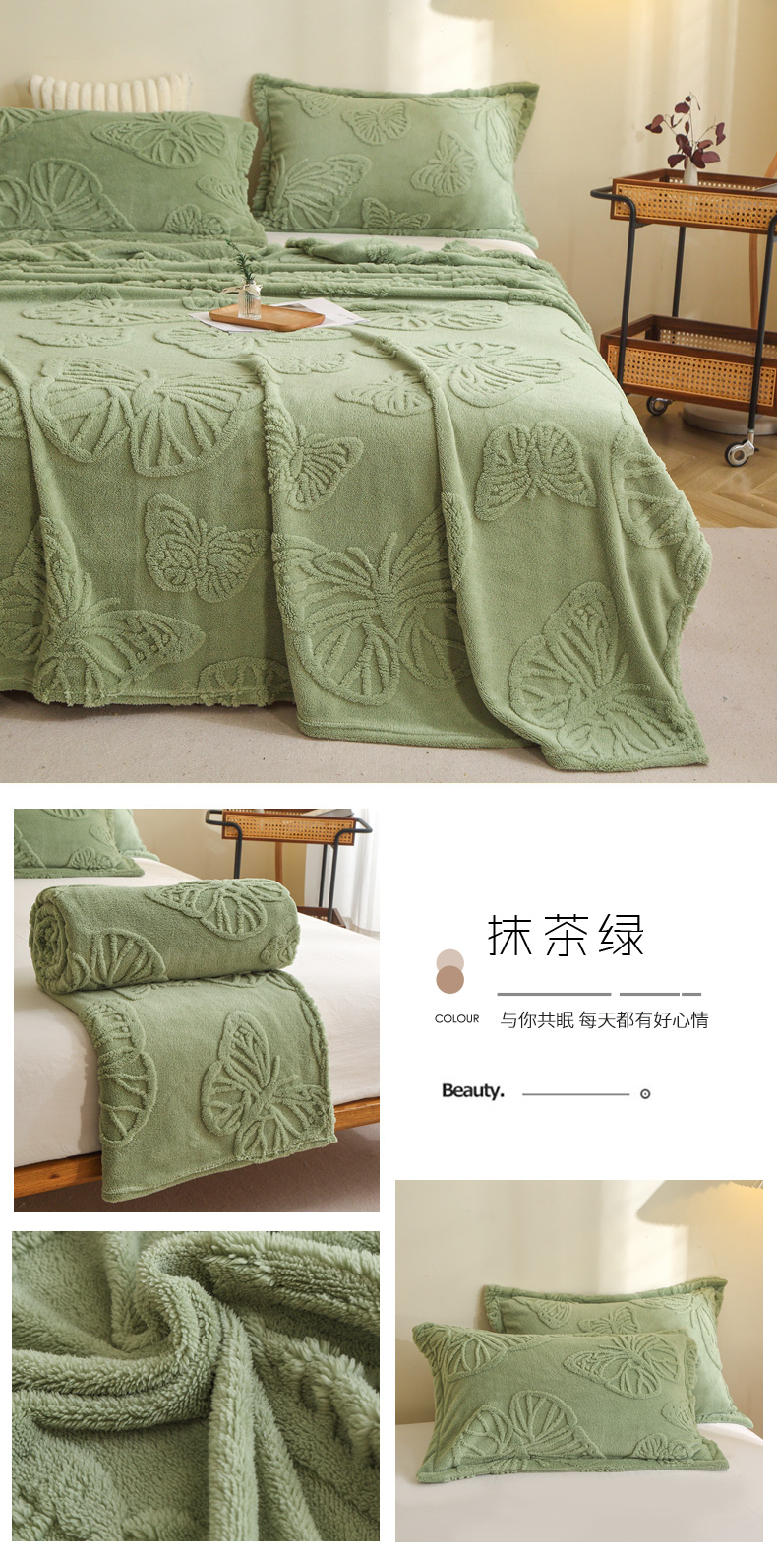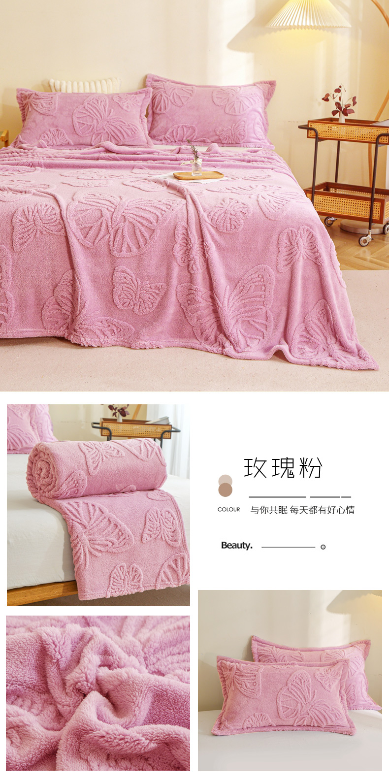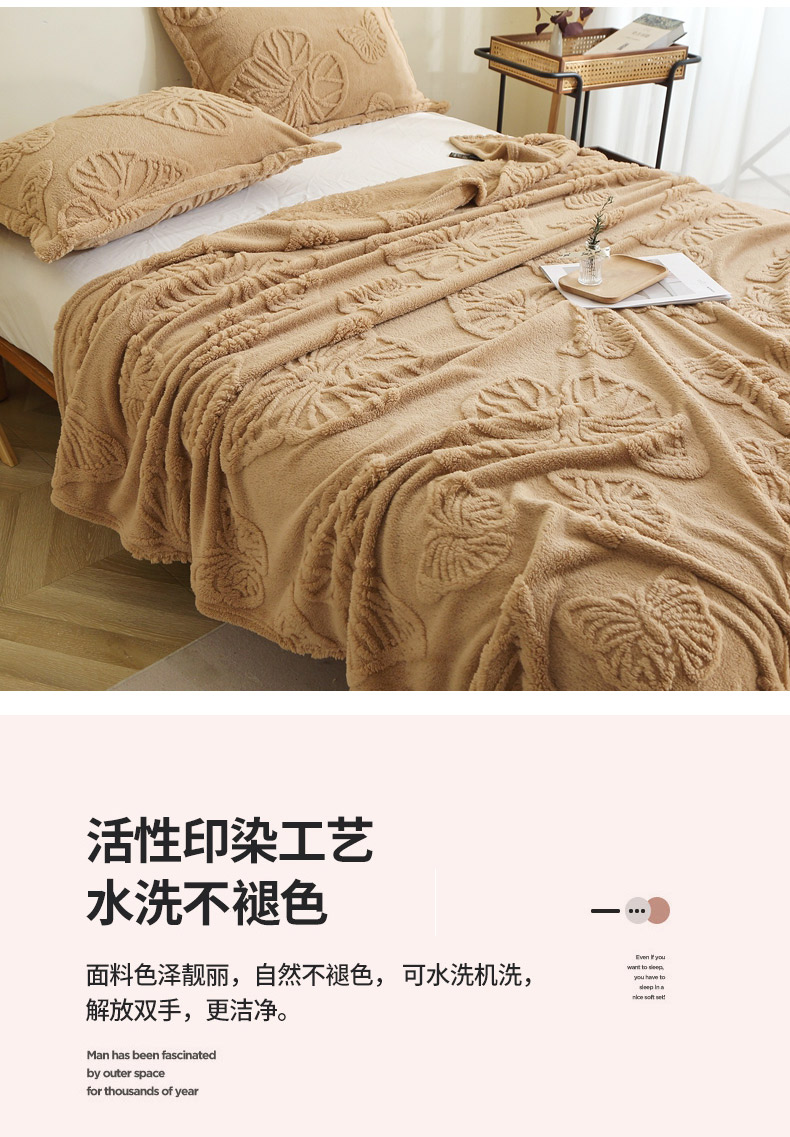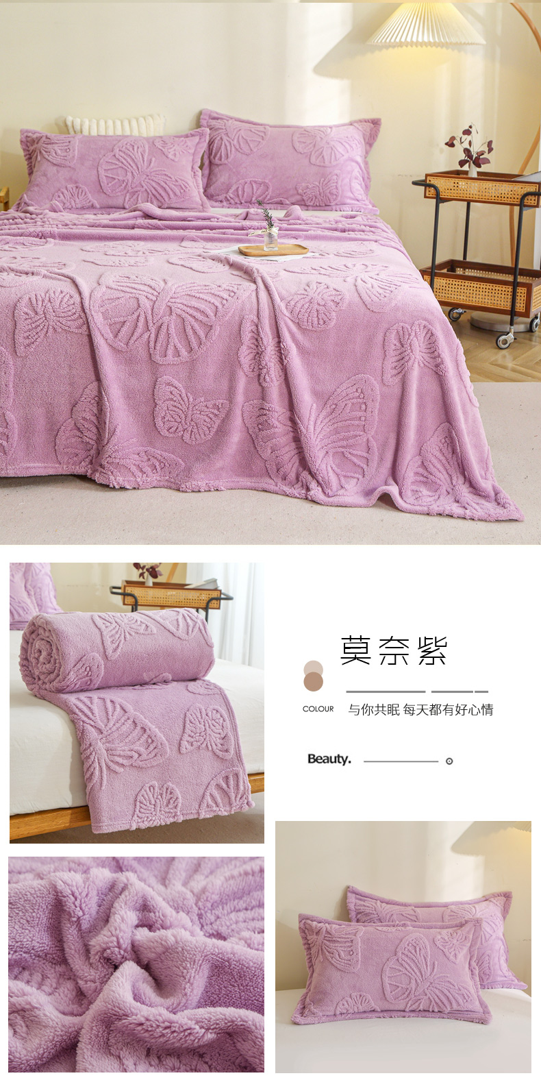 栩裕纺织 2024新款蝴蝶提花卷边款多功能毛毯 蓝灰-卷边款