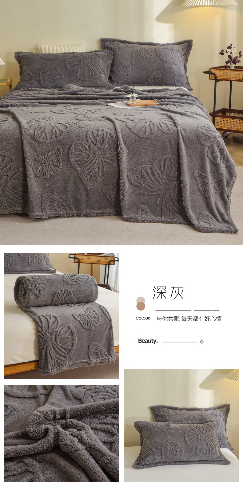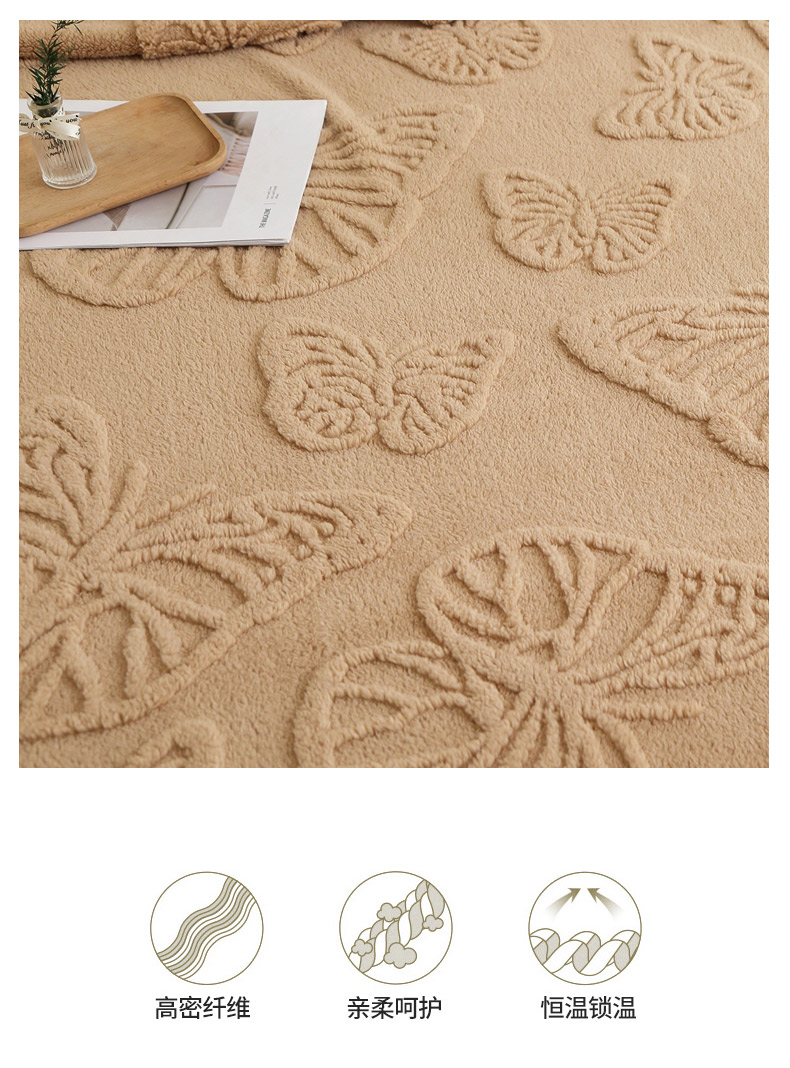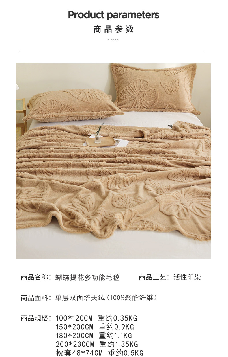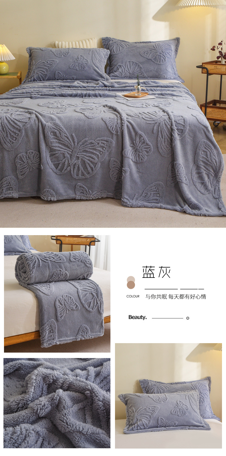 商品名称:栩裕纺织 2024新款蝴蝶提花卷边款多功能毛毯 蓝灰-卷边款
