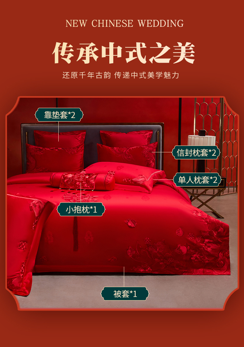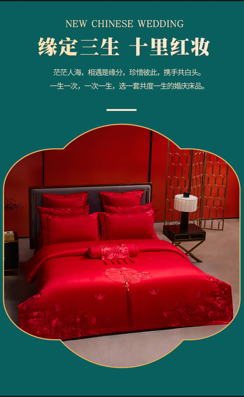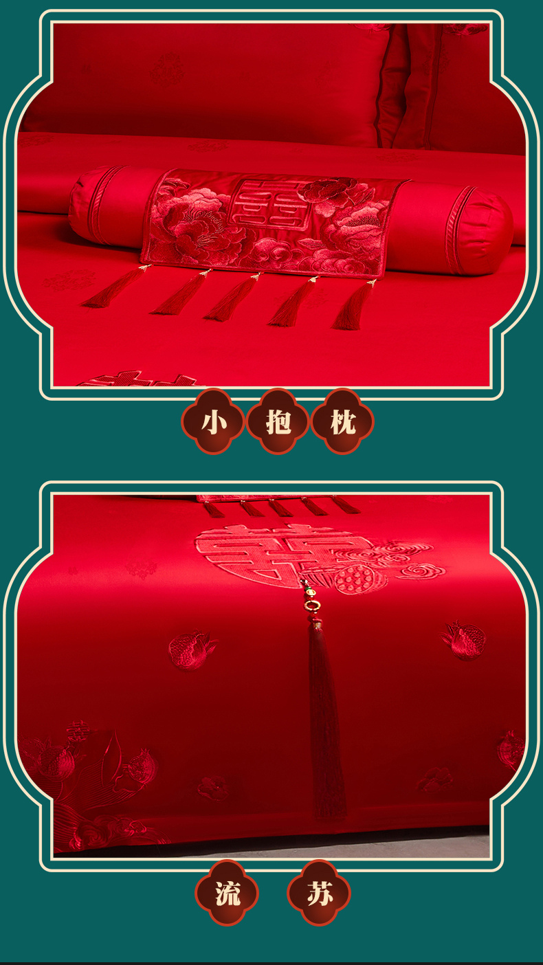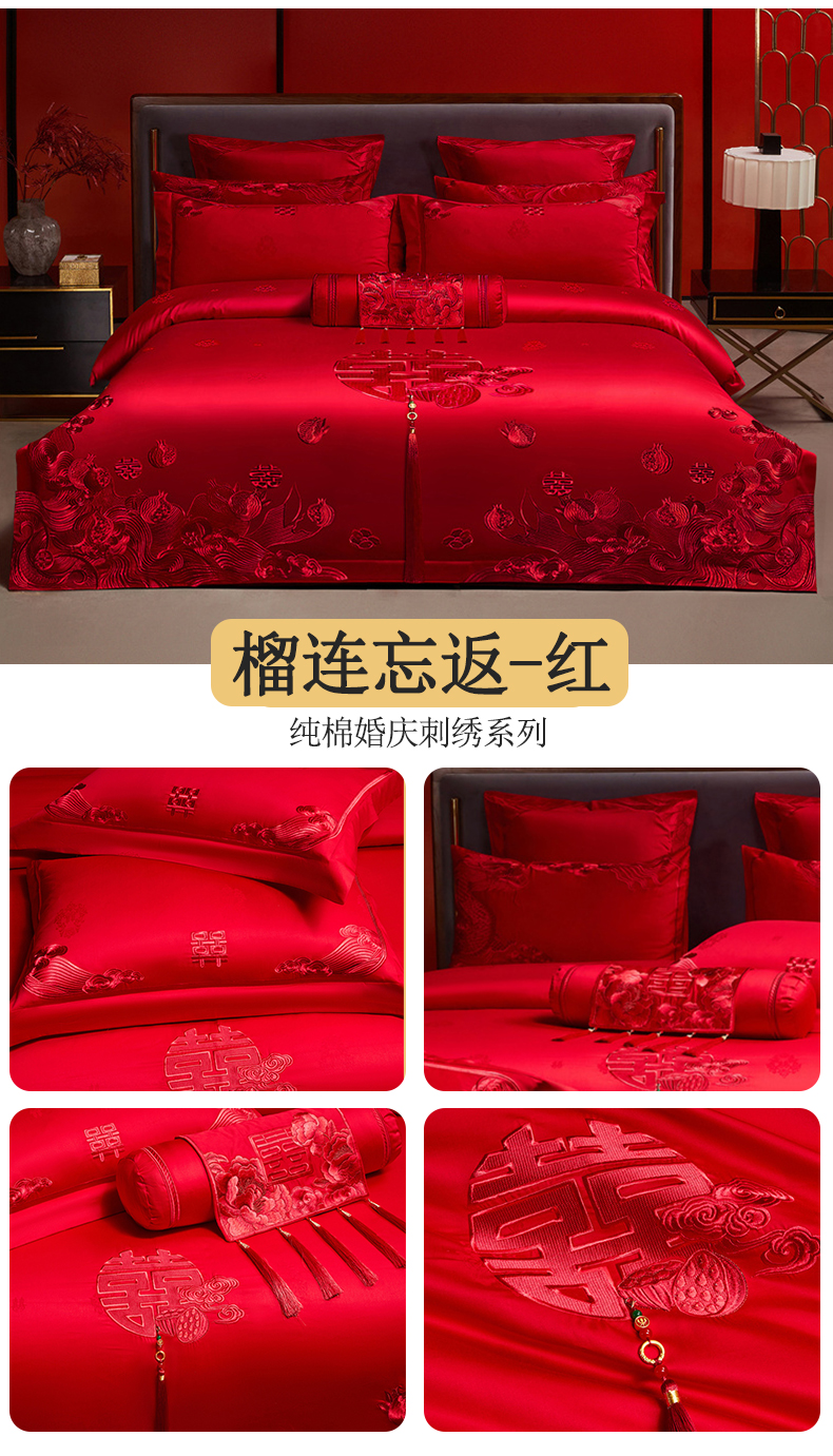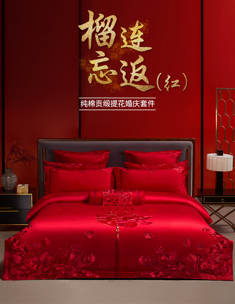 当前位置: 91家纺网 > 商品网购 > 床品套件 > 四件套 > 婚庆四件套 > 宏羽纺家纺 2025新款高支高密全棉提花新中式婚庆多件套 高支高密榴连忘返-红