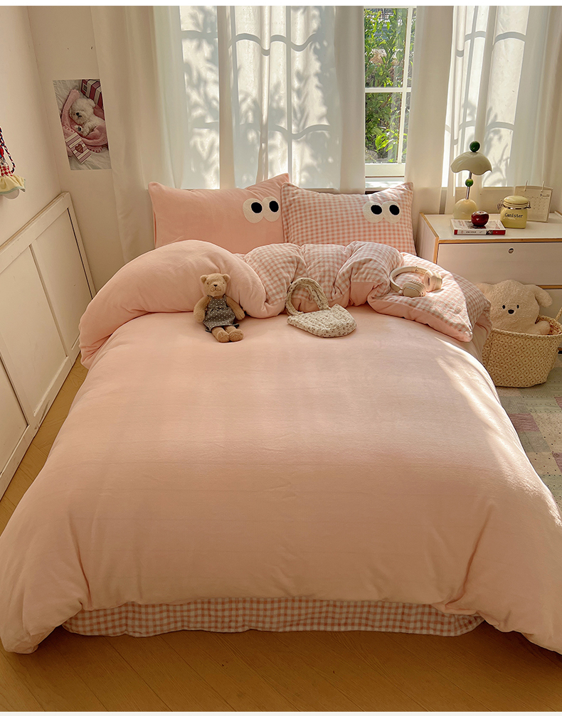 当前位置: 91家纺网 > 商品网购 > 床品套件 > 四件套 > 牛奶绒四件套 > 桃子家居 2025新款A类ins加厚毛巾绣大眼萌混搭撞色奶油格子牛奶绒系列四件套 绒毛巾绣-大眼萌蜜桃粉格