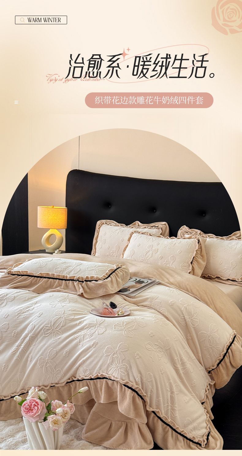 (总)绘萱家居 2025新款新品爆款高密消光织带花边款雕花牛奶绒四件套,艾薇儿-白卡其,薇薇安-粉,妮娜-绿,眷恋-粉,艾薇儿-紫,薇薇安-兰,薇薇安-紫,眷恋-兰,眷恋-白卡其,艾薇儿-兰,香蝶-白卡其,眷恋-紫,艾薇儿-粉,薇薇安-白卡其,妮娜-粉,薇薇安-绿,香蝶-粉,香蝶-兰,香蝶-紫,伊莉莎-粉,伊莉莎-紫