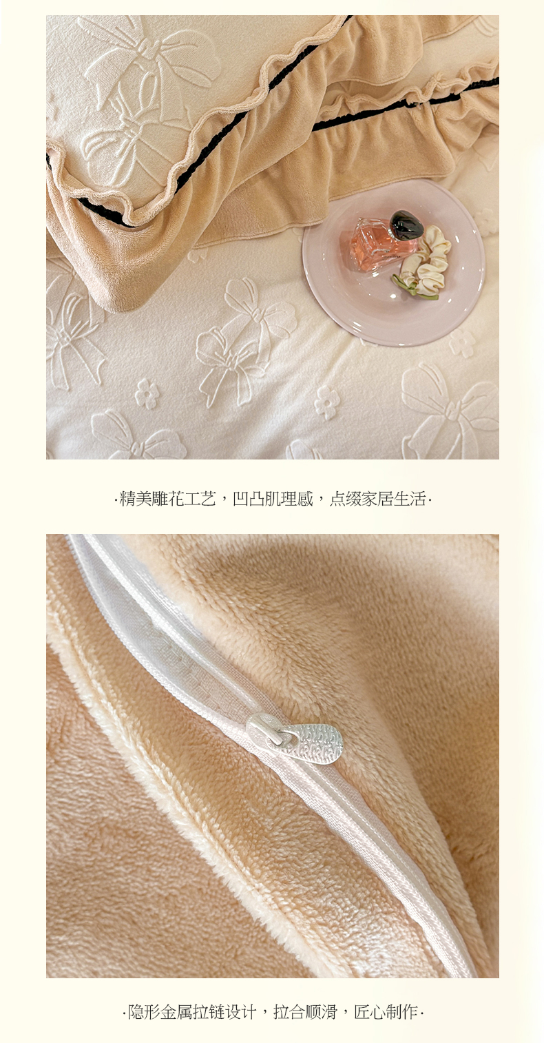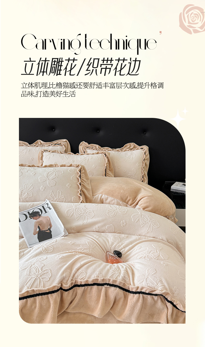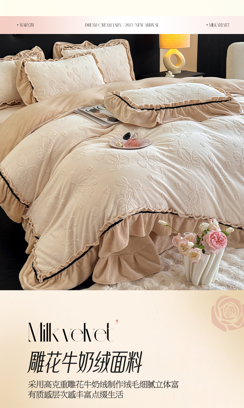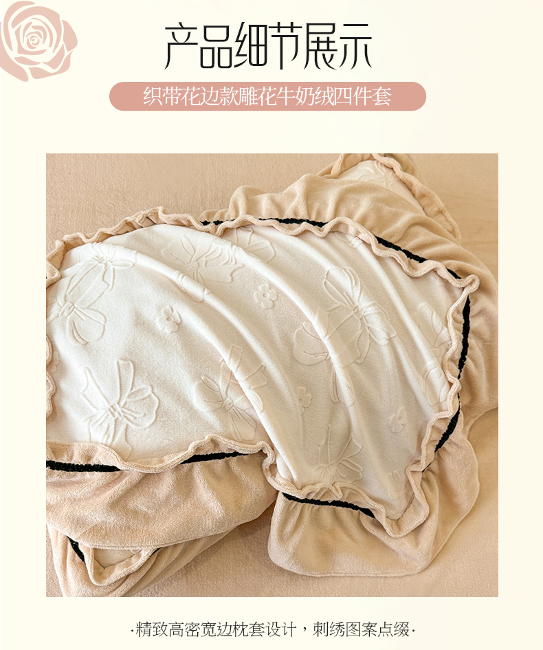 绘萱家居 2025新款新品爆款高密消光织带花边款雕花牛奶绒四件套 薇薇安-白卡其