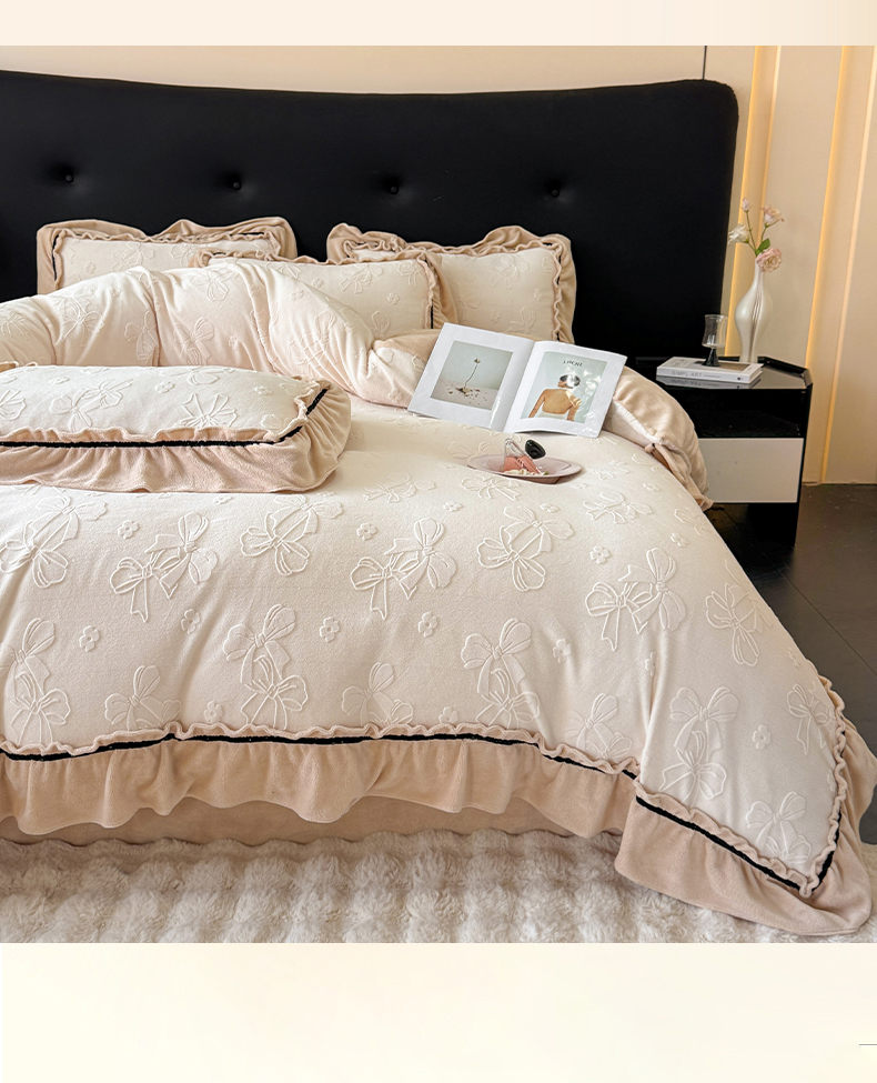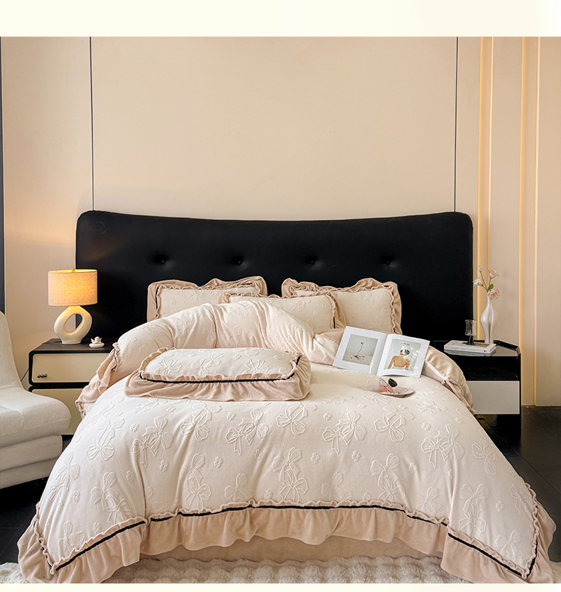 商品名称:绘萱家居 2025新款新品爆款高密消光织带花边款雕花牛奶绒四件套 薇薇安-白卡其