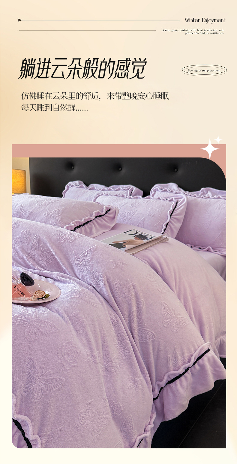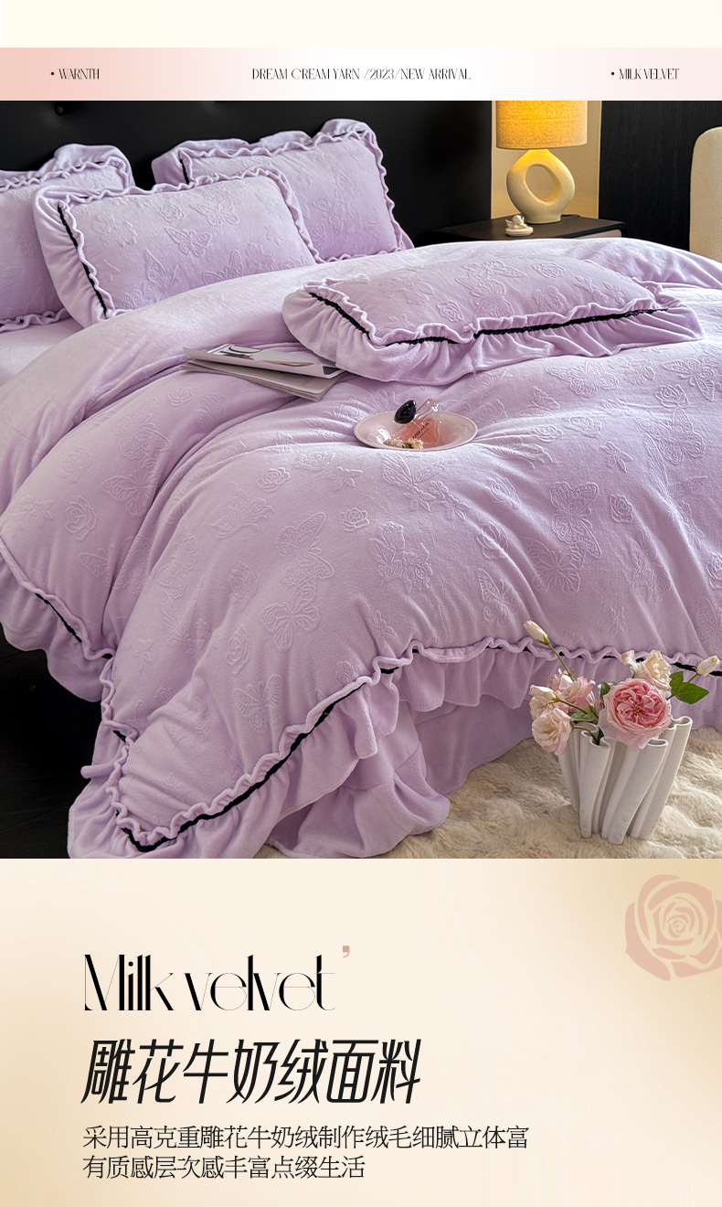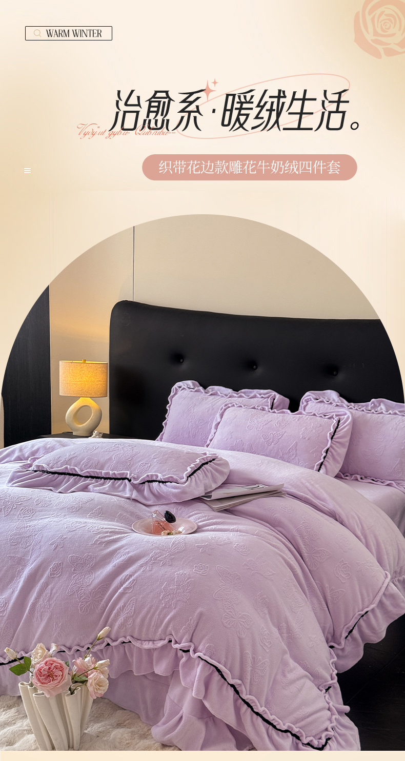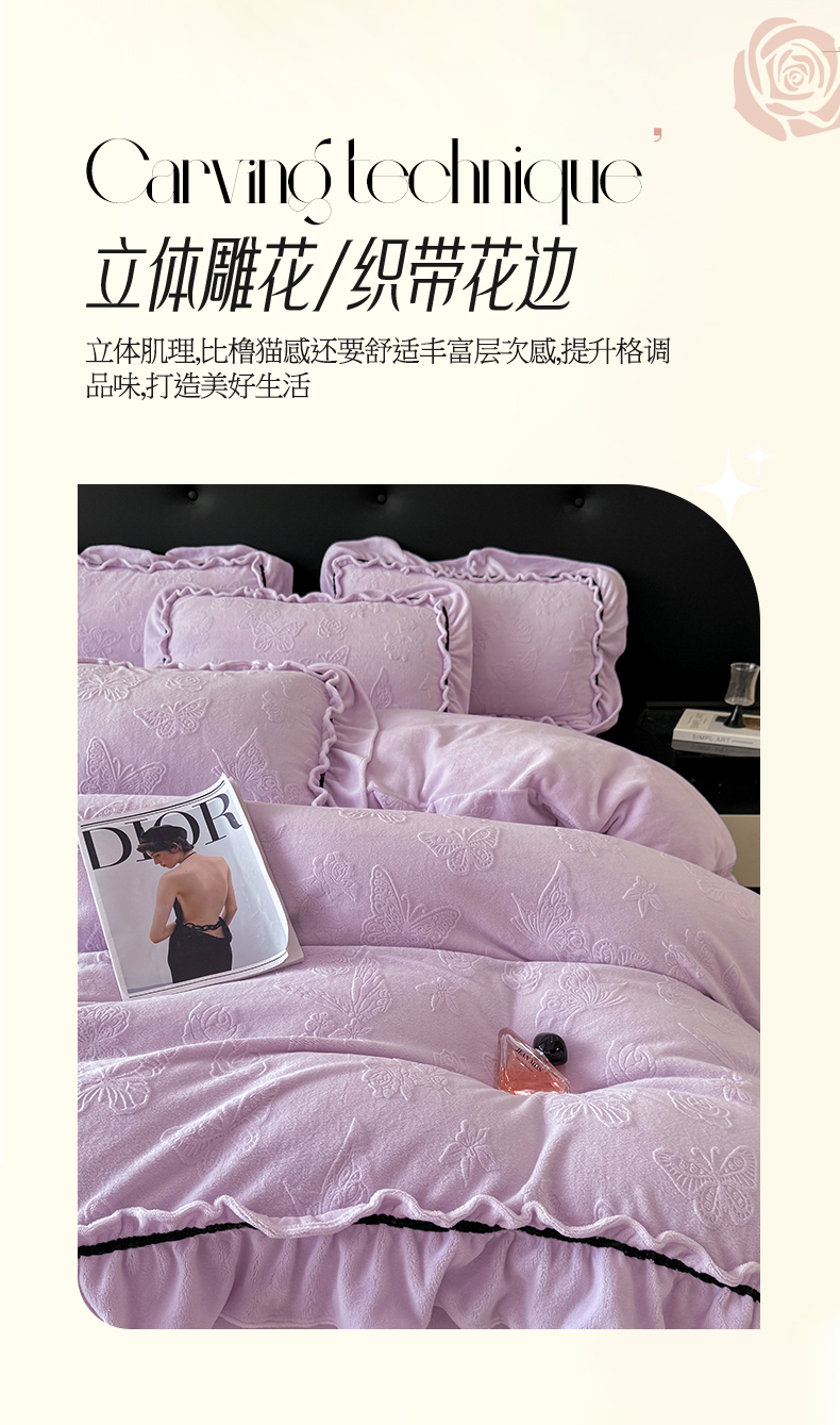绘萱家居 2025新款新品爆款高密消光织带花边款雕花牛奶绒四件套 香蝶-紫