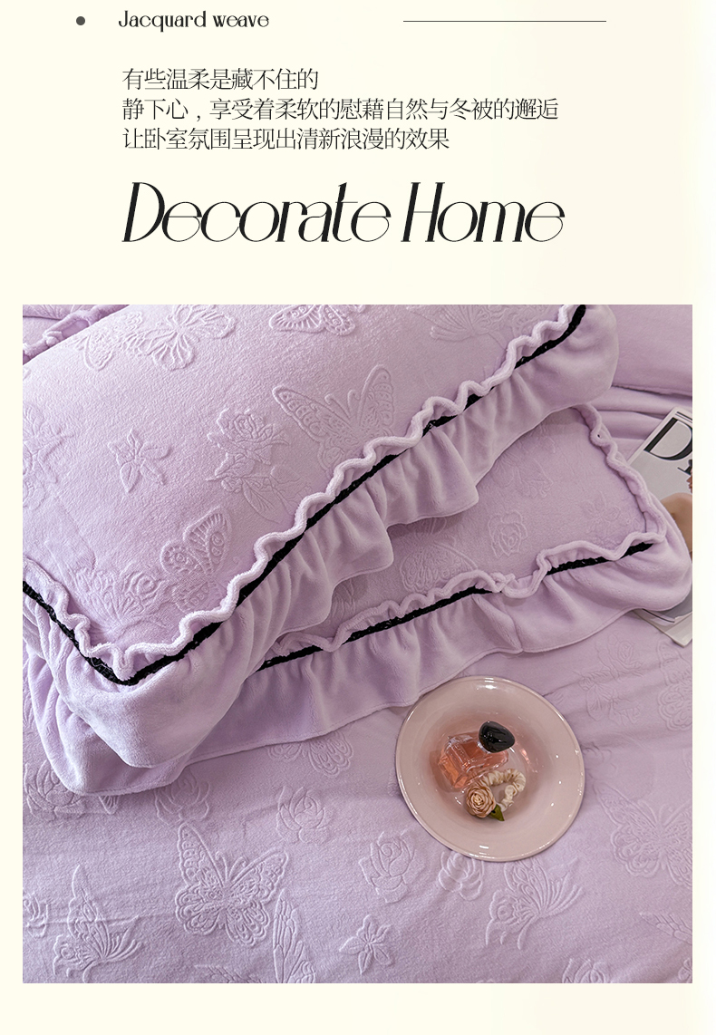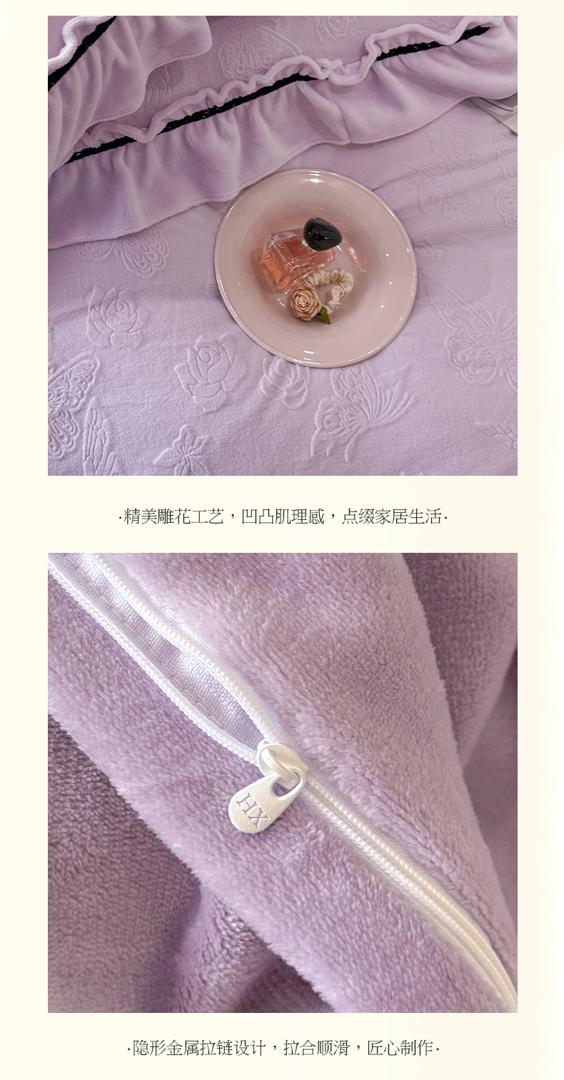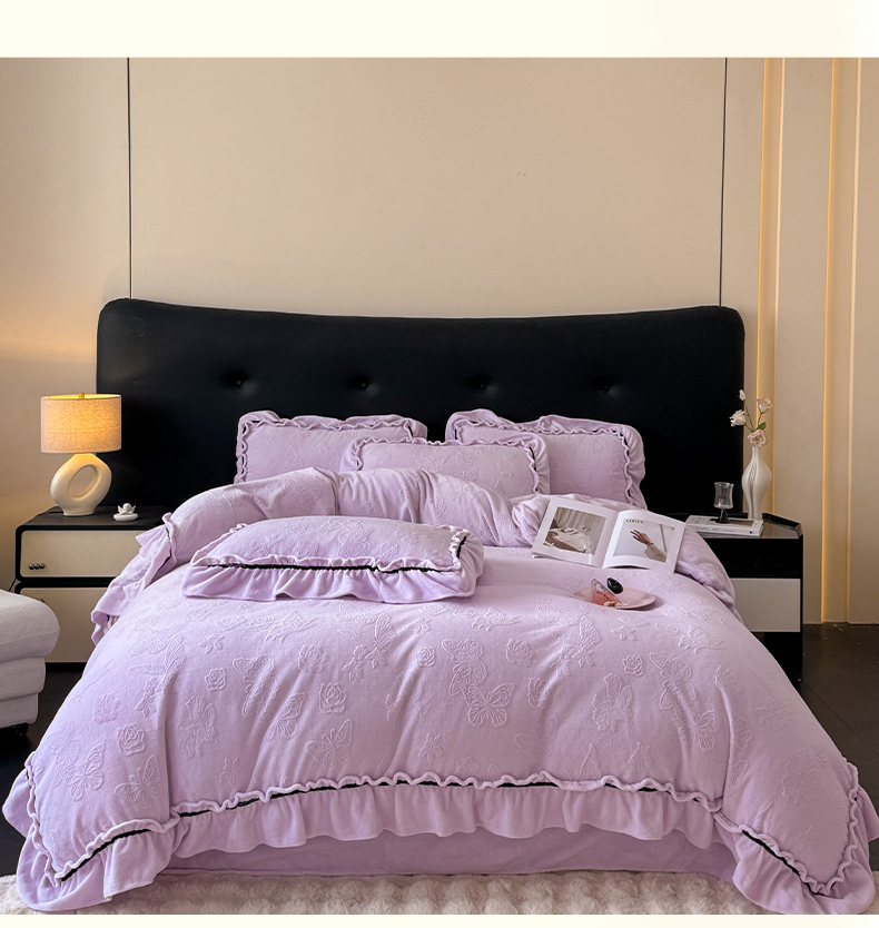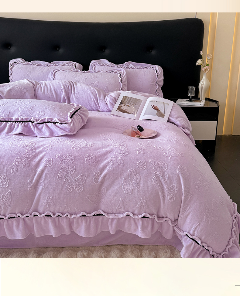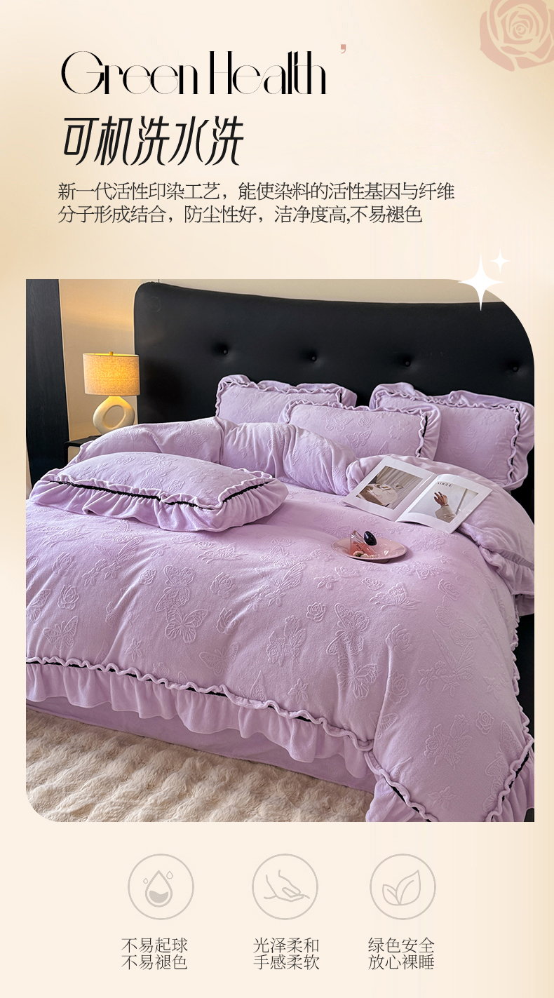 绘萱家居 2025新款新品爆款高密消光织带花边款雕花牛奶绒四件套 香蝶-紫