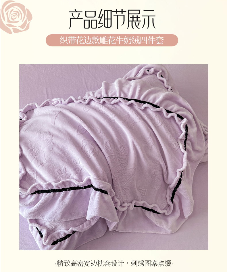 商品名称:绘萱家居 2025新款新品爆款高密消光织带花边款雕花牛奶绒四件套 香蝶-紫