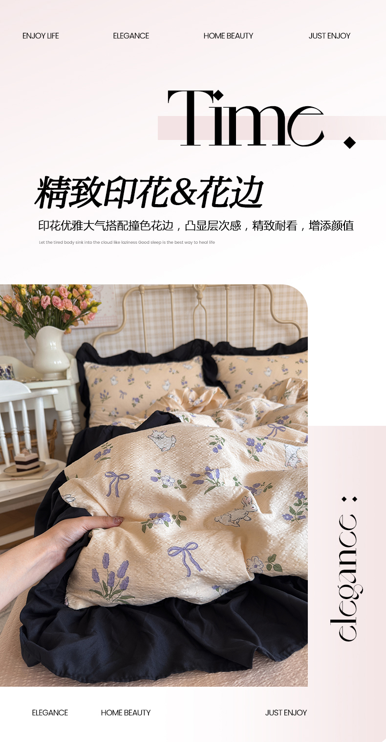 当前位置: 91家纺网 > 商品网购 > 床品套件 > 四件套 > 双层纱四件套 > 优卡迪家纺馆 2025新款皱皱棉双层纱黑花边四件套 泡沫之夏