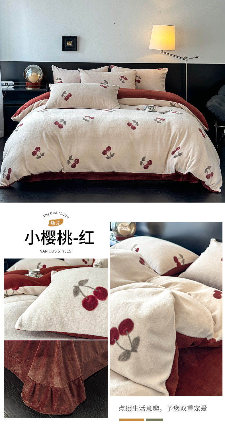 商品名称:子曰 2025新款A类高克重蒂肤绒羊绒保暖印花四件套 小樱桃-红