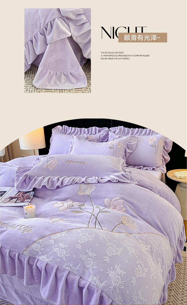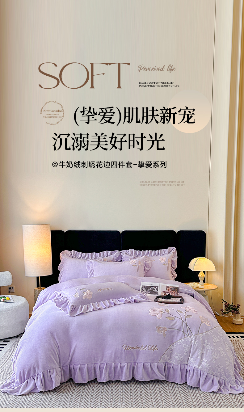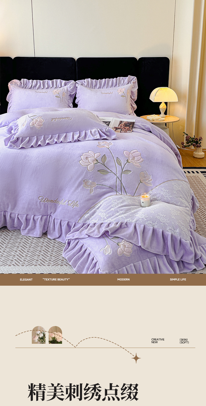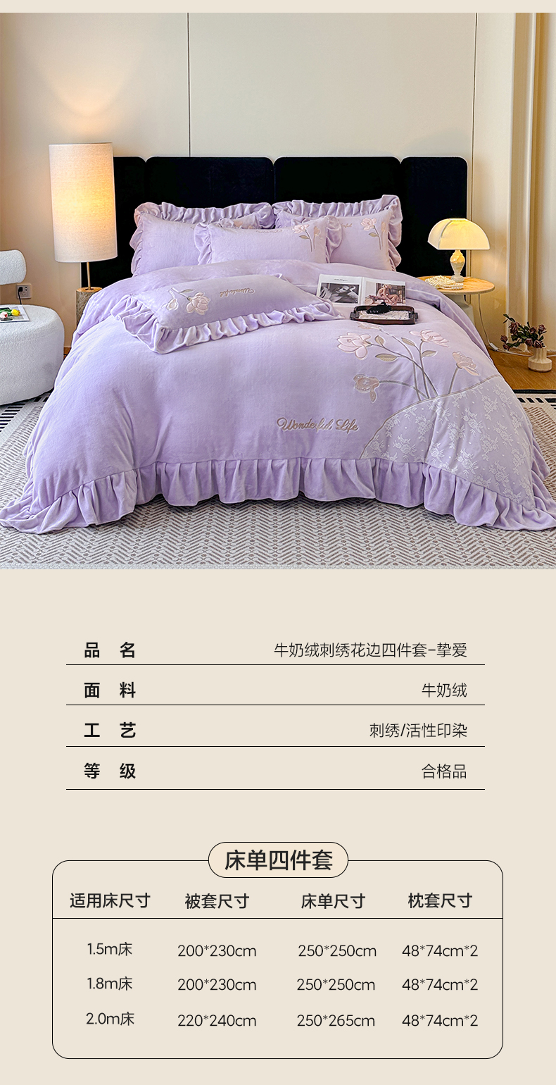 商品名称:民新家纺 2025新款牛奶绒刺绣花边四件套-挚爱 挚爱-浅紫
