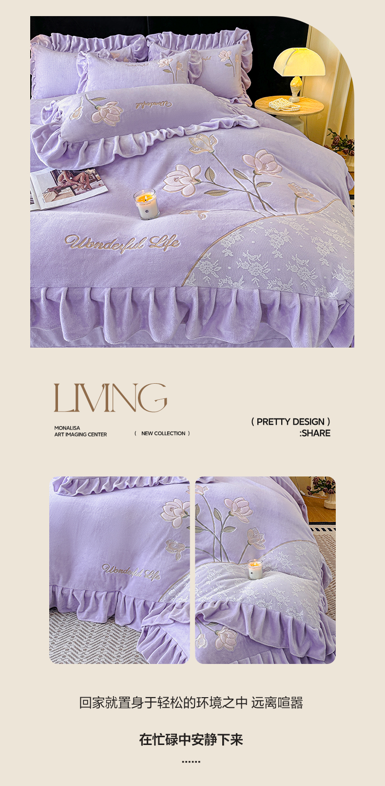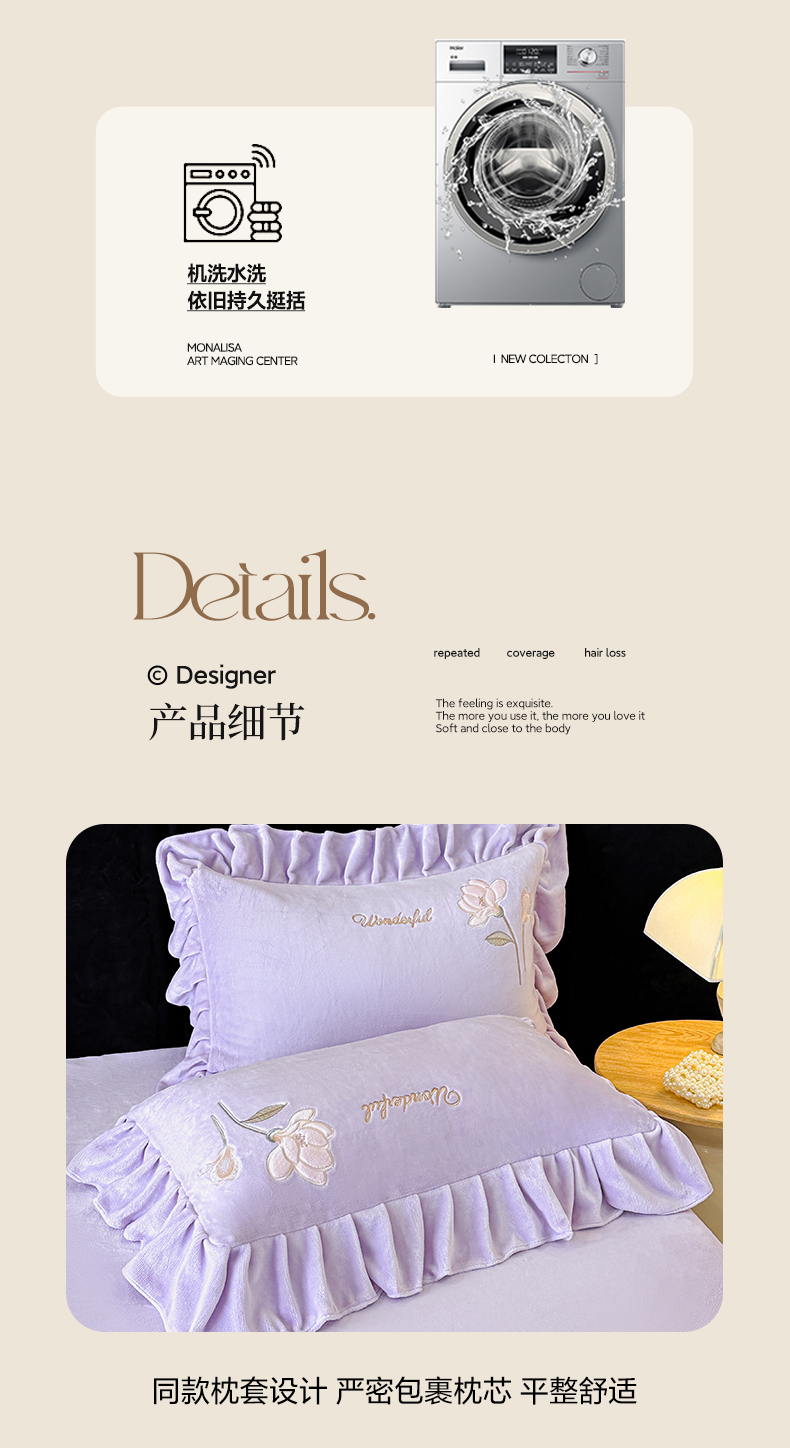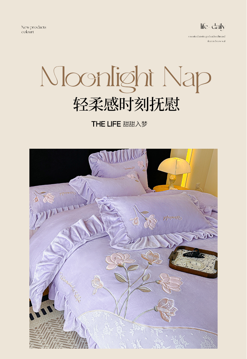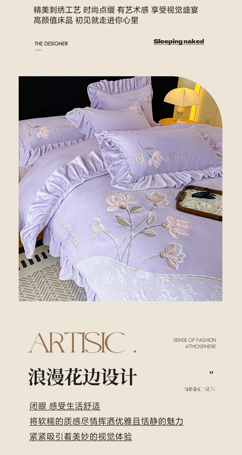 商品名称:民新家纺 2025新款牛奶绒刺绣花边四件套-挚爱 挚爱-浅紫