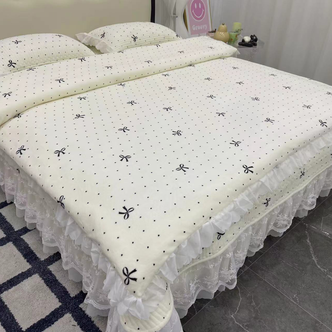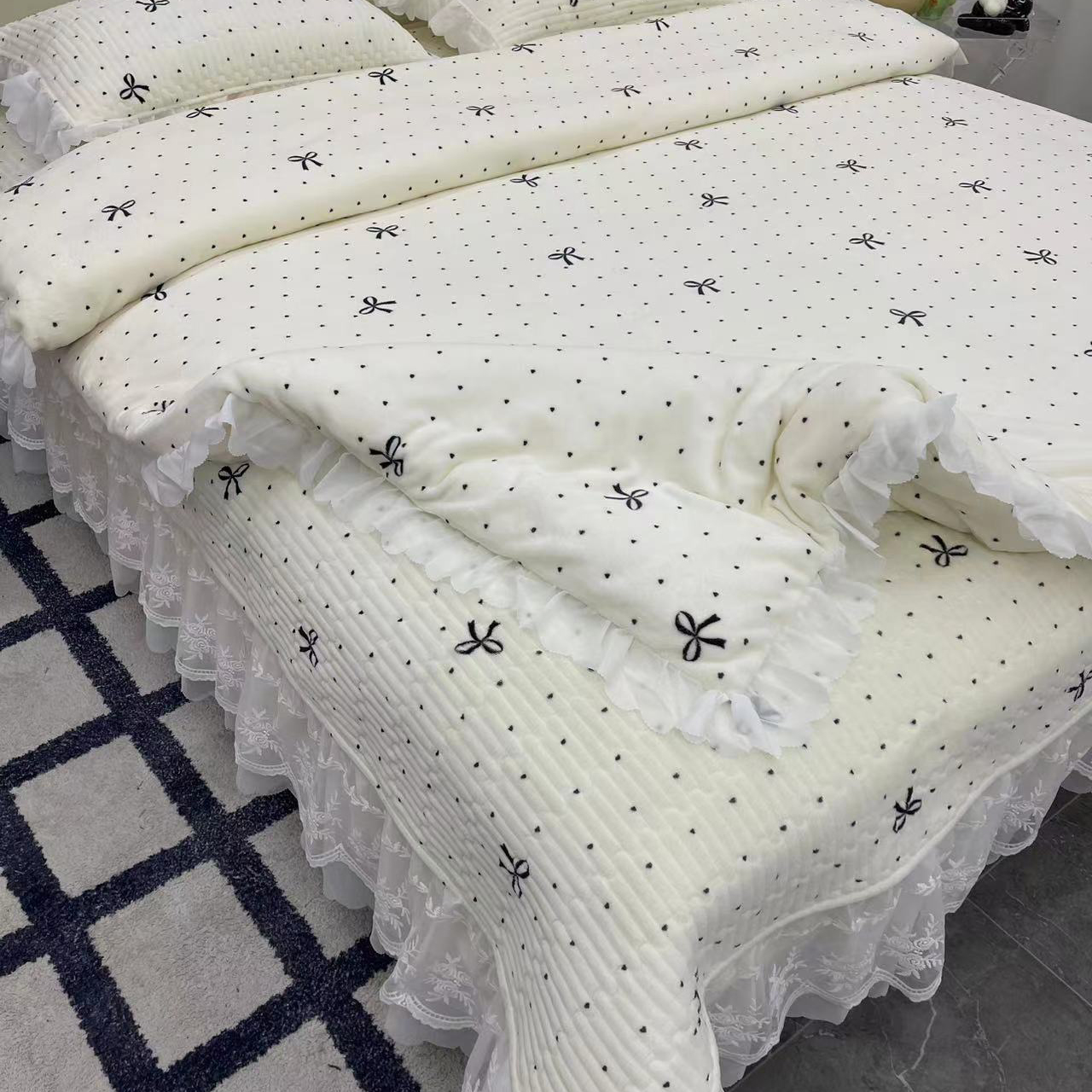 (总)禧瑞谷 2025新款冬季牛奶绒双层蕾丝花边床盖三件套床盖四件套,点点蝴蝶结,粉底小狗,蓝底小狗,奶油小狗,星月小确幸,KT猫,蝶舞白色,蓝底爱心,洛丽塔蓝,碎花小女孩,波点,草莓蝴蝶结,蓝色蝴蝶结,奶糖少女,蛋糕猫