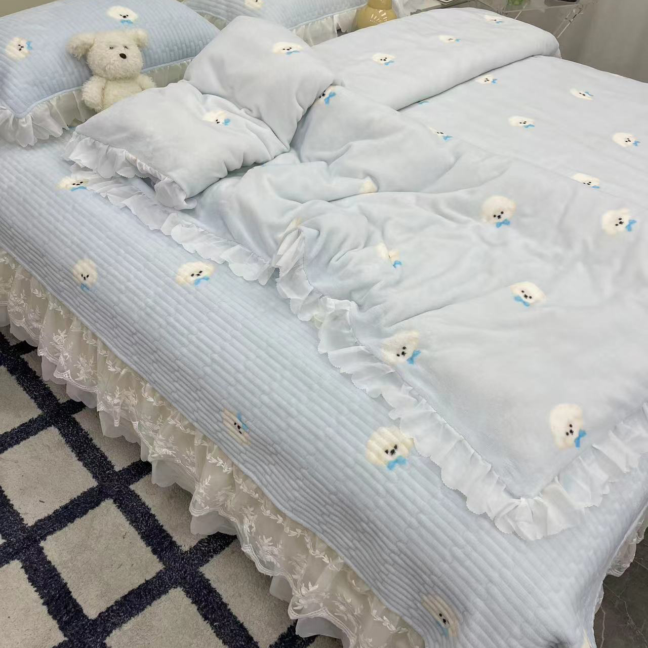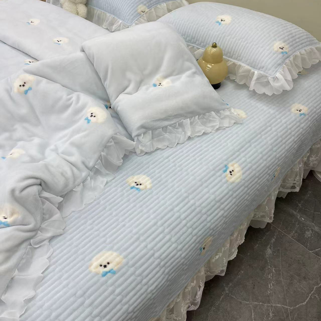 禧瑞谷 2025新款冬季牛奶绒双层蕾丝花边床盖三件套床盖四件套 蓝底小狗
