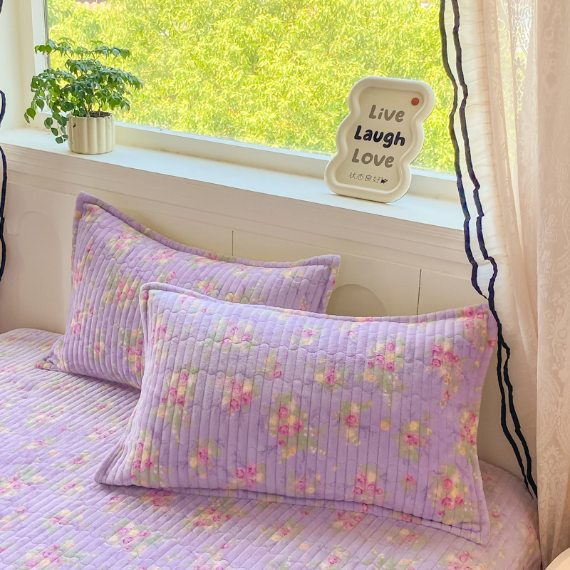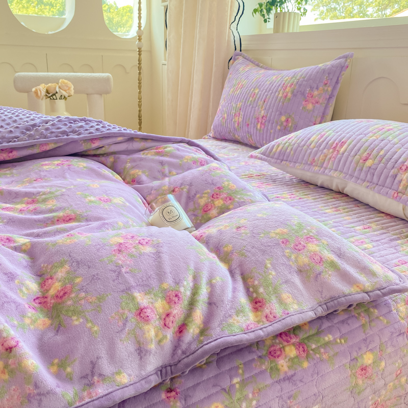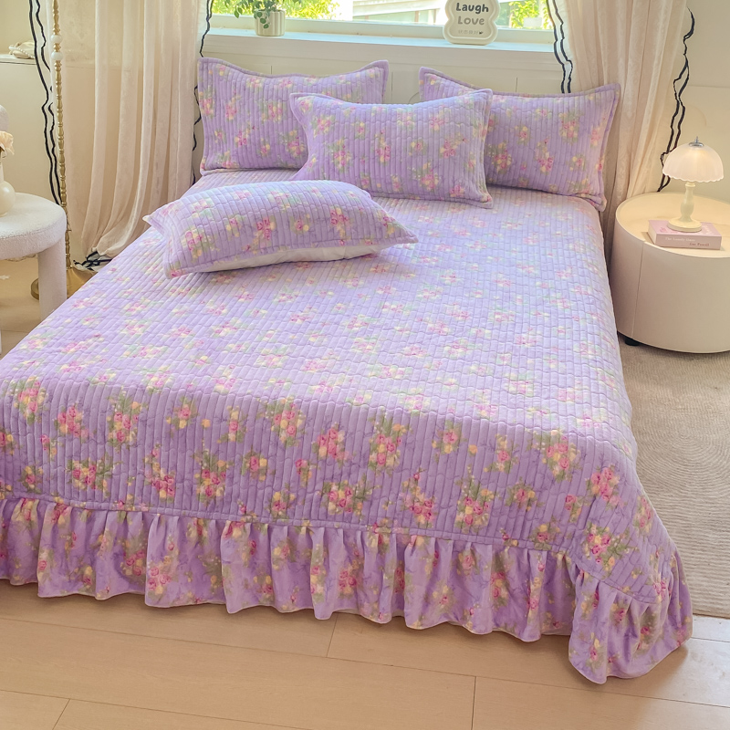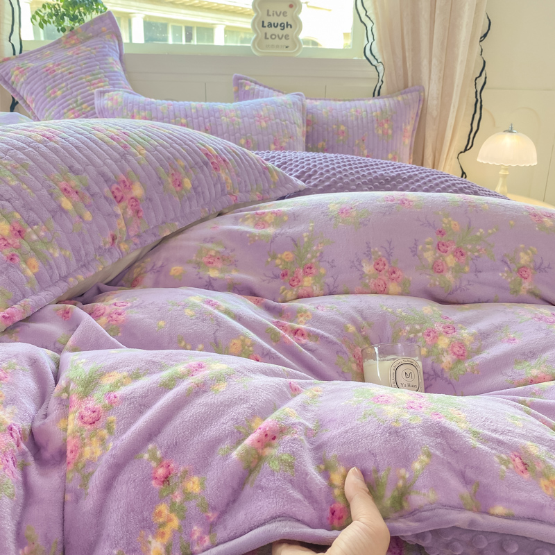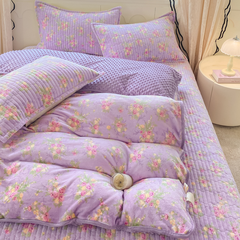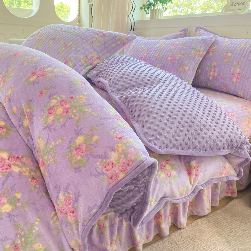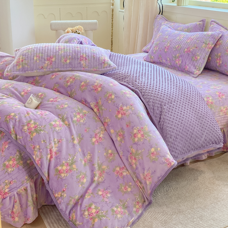 尚美 2025新款豆豆绒牛奶绒大花边床盖四件套-系列2(床盖花边随机) 紫苏