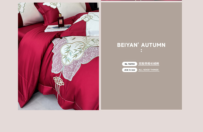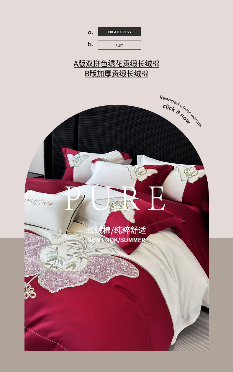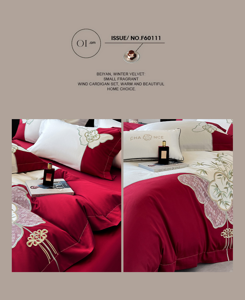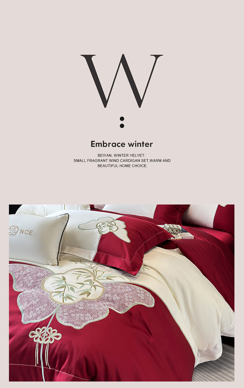商品名称:丞音 新中式轻奢风A类长绒棉50s双股100支贡缎绣花全棉被套刺绣纯棉四件套床笠高档礼盒包装 竹叶清风-千禧红