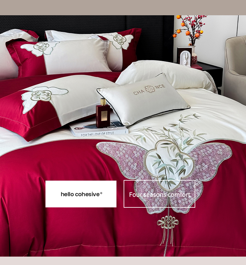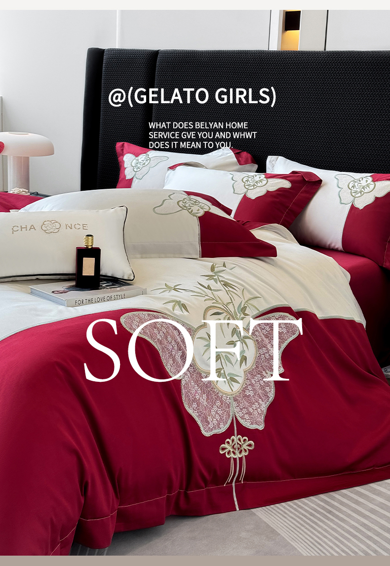 丞音 新中式轻奢风A类长绒棉50s双股100支贡缎绣花全棉被套刺绣纯棉四件套床笠高档礼盒包装 竹叶清风-千禧红