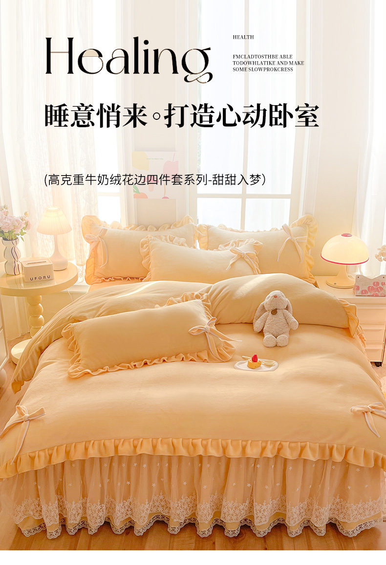(总)后庭寝室 2025新款高克重牛奶绒公主风床裙四件套-甜心系列,甜心-粉玉,甜心-嫩黄,甜心-浅粉,甜心-浅蓝,甜心-浅紫,甜心-玉色