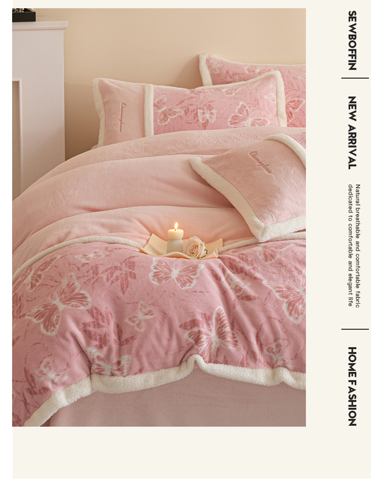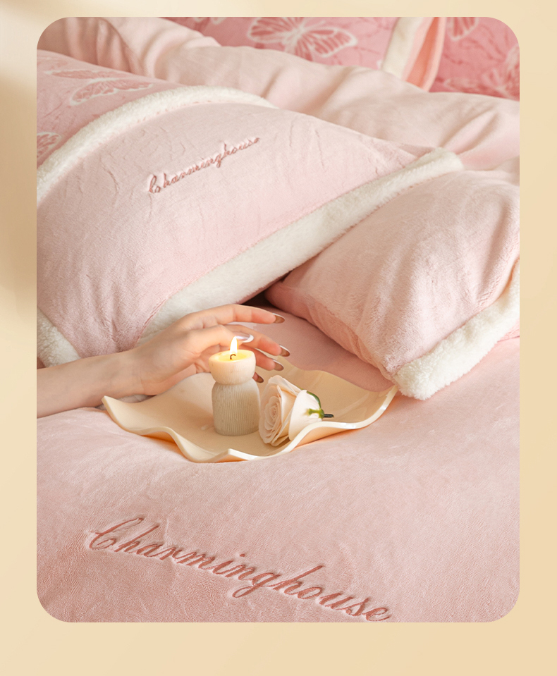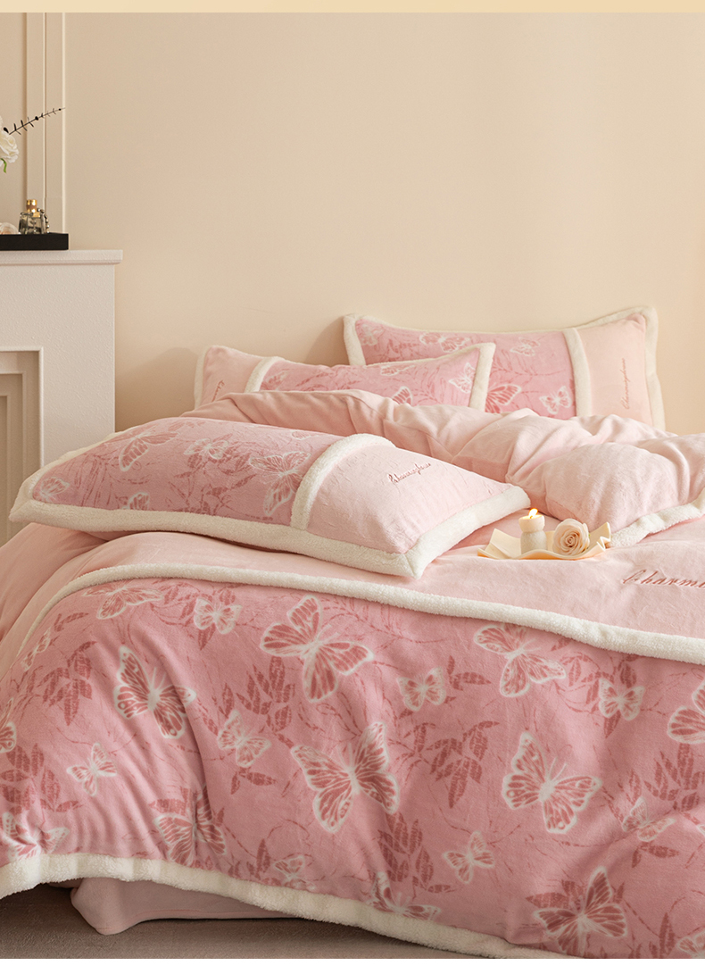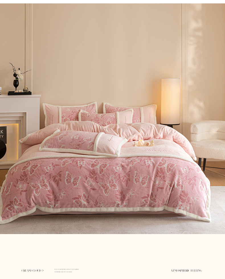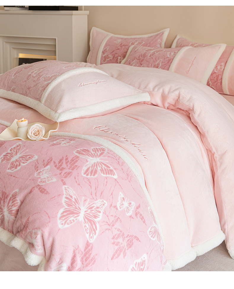 商品名称:遇见家居生活馆 2025新款高克重雕花绒拼接刺绣四件套系列-艾菲妮 蝴蝶-靓粉(深)