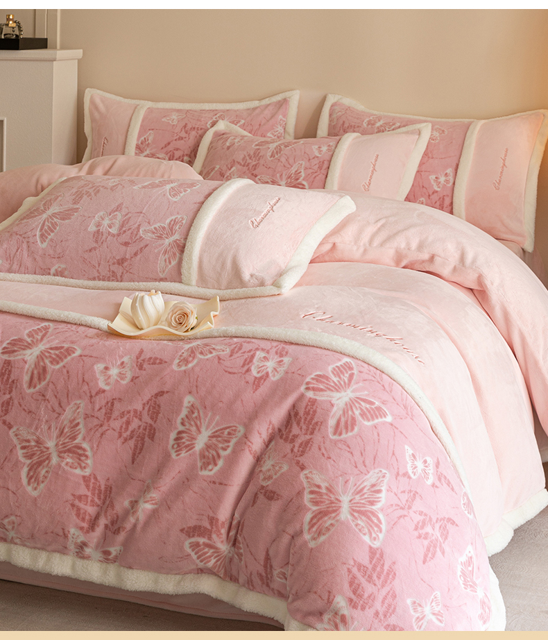 遇见家居生活馆 2025新款高克重雕花绒拼接刺绣四件套系列-艾菲妮 蝴蝶-靓粉(深)