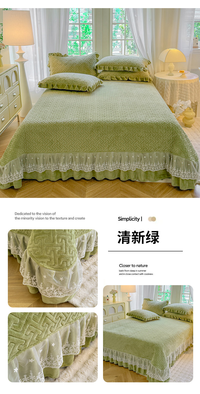 优家居 2025秋冬高克重牛奶绒床盖夹棉床裙纯色蕾丝边花边刺绣法式公主风床罩夹棉床盖 冰川灰