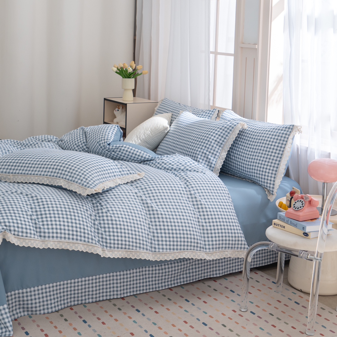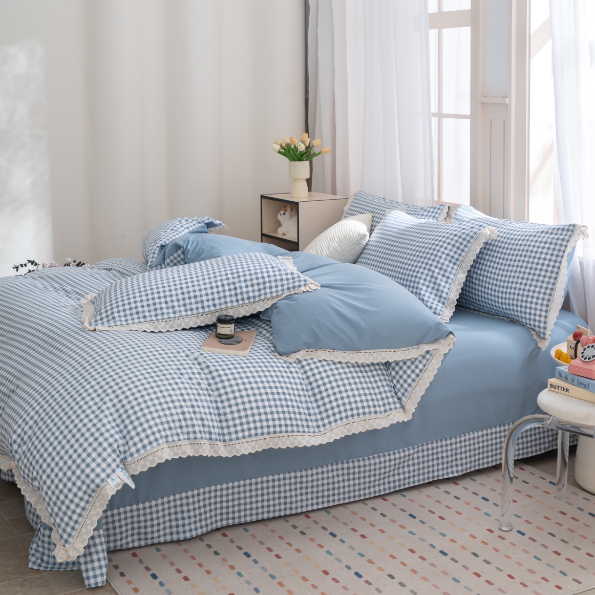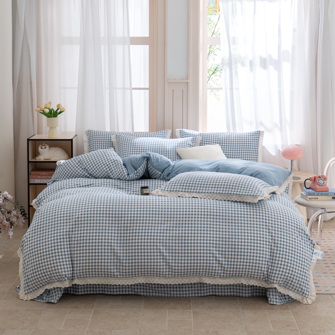 玖琳家纺 2025新款云朵水洗棉皱皱纱精致花边款四件套 蓝小格