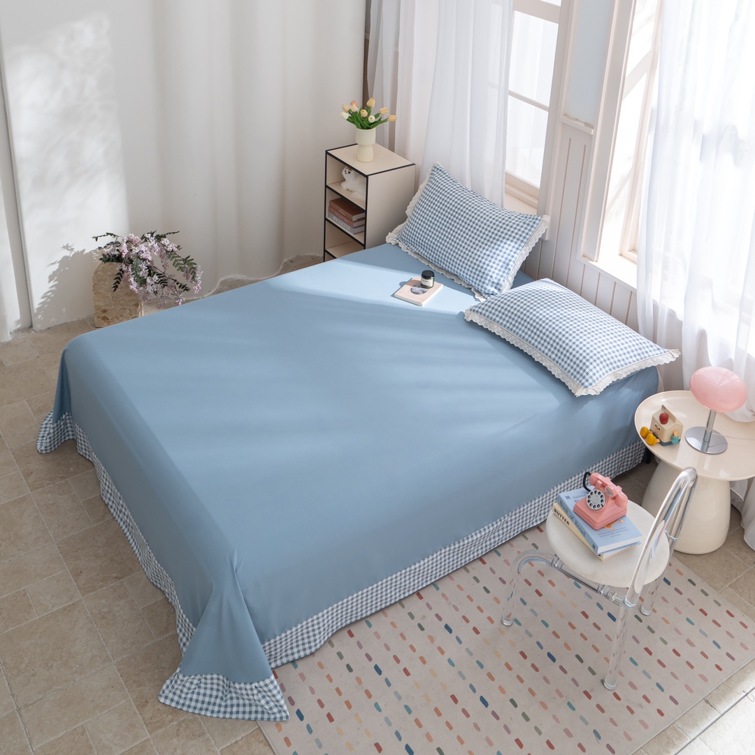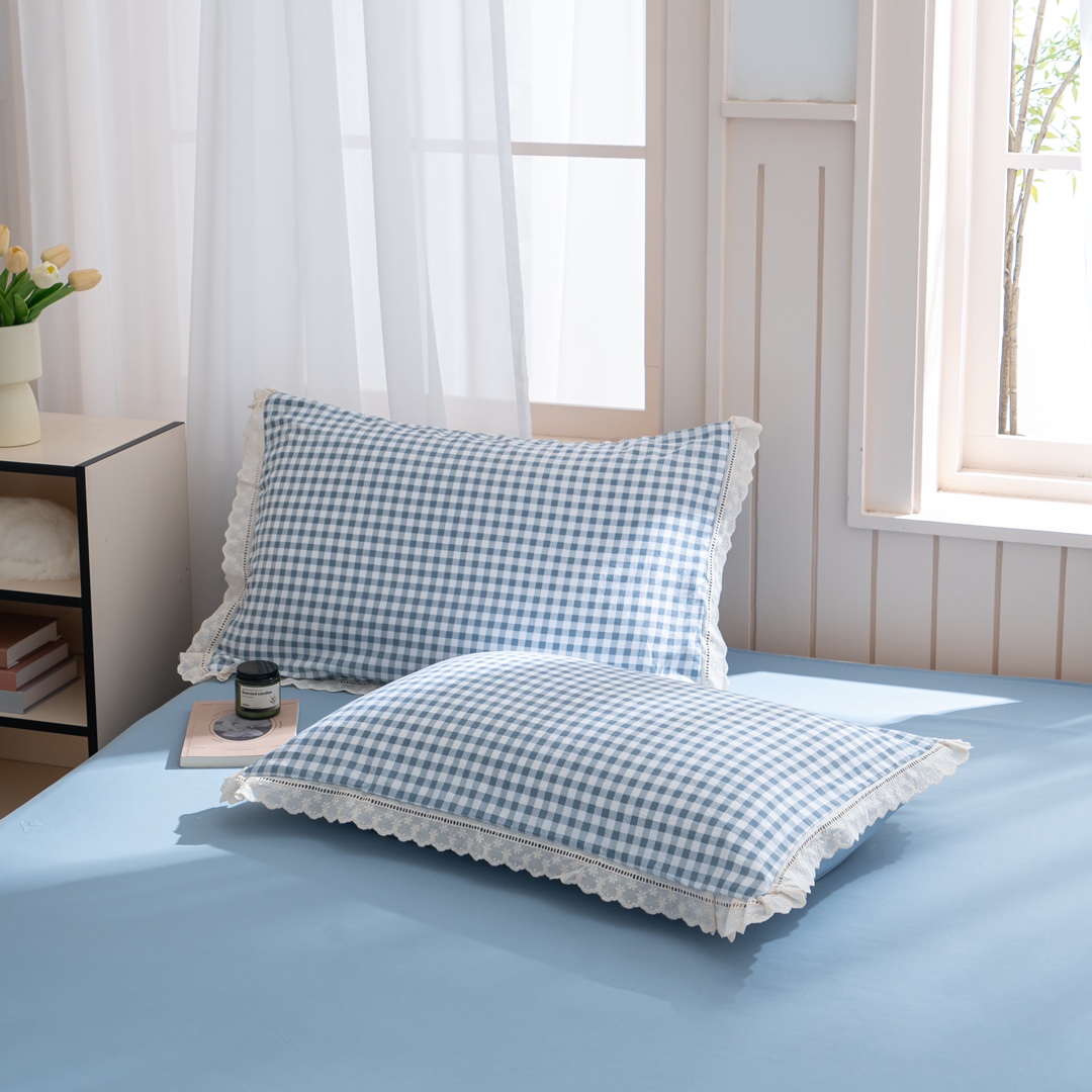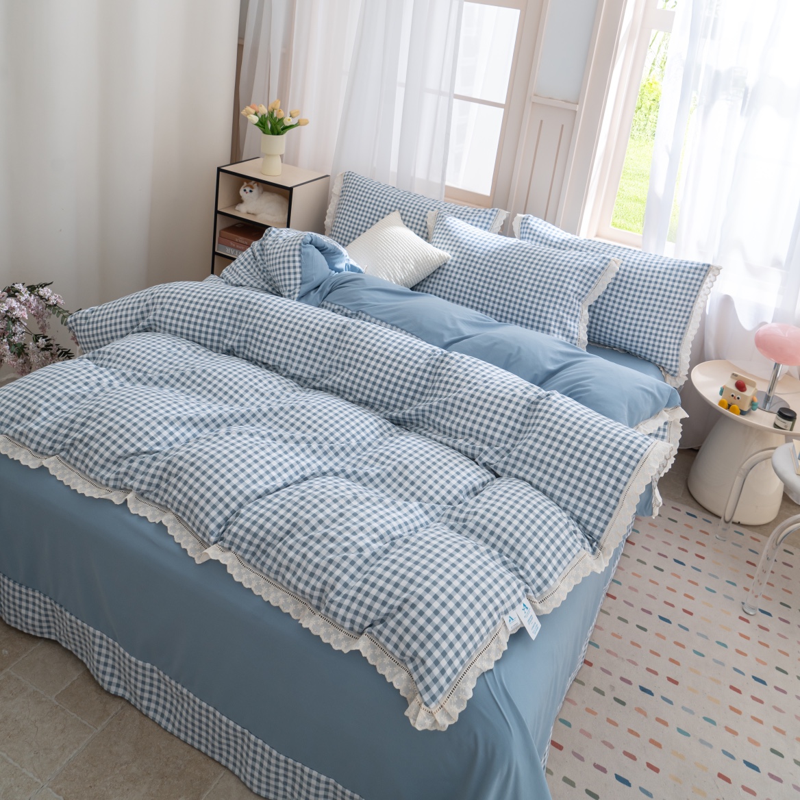 玖琳家纺 2025新款云朵水洗棉皱皱纱精致花边款四件套 蓝小格