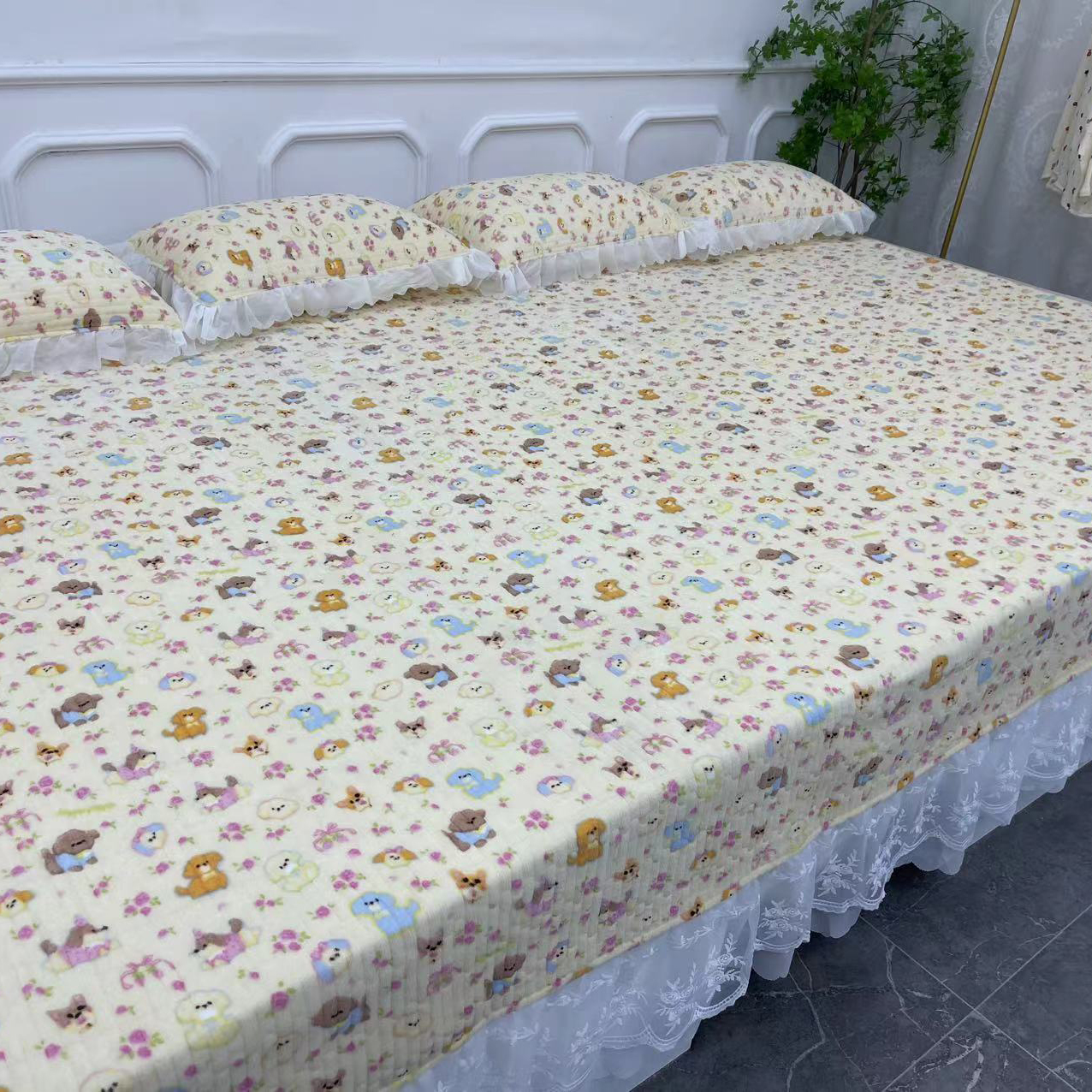 禧瑞谷 2025新款双层花边纯棉床盖雪纺蕾丝款纯棉床盖四件套 彩条熊,彩条熊