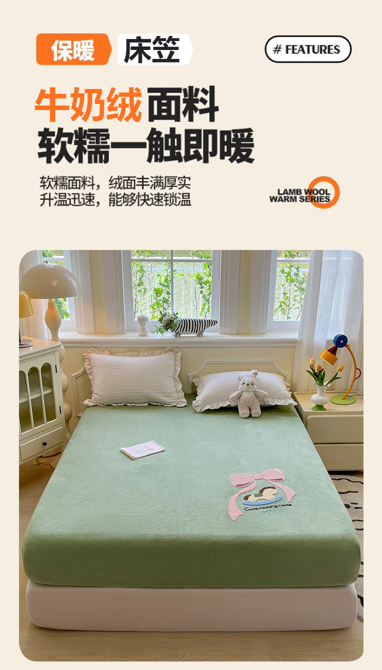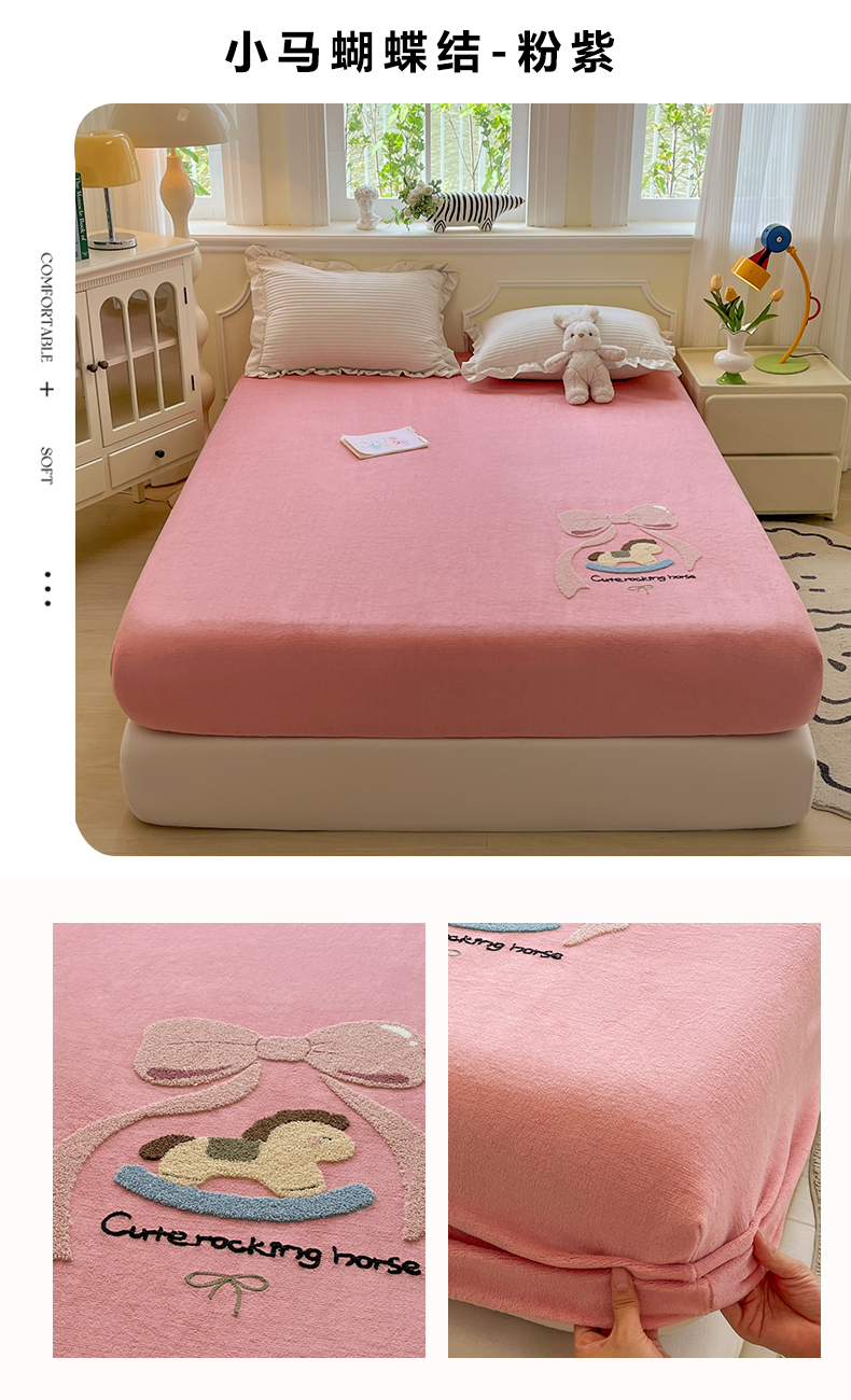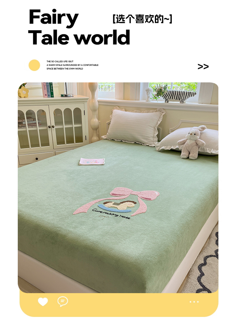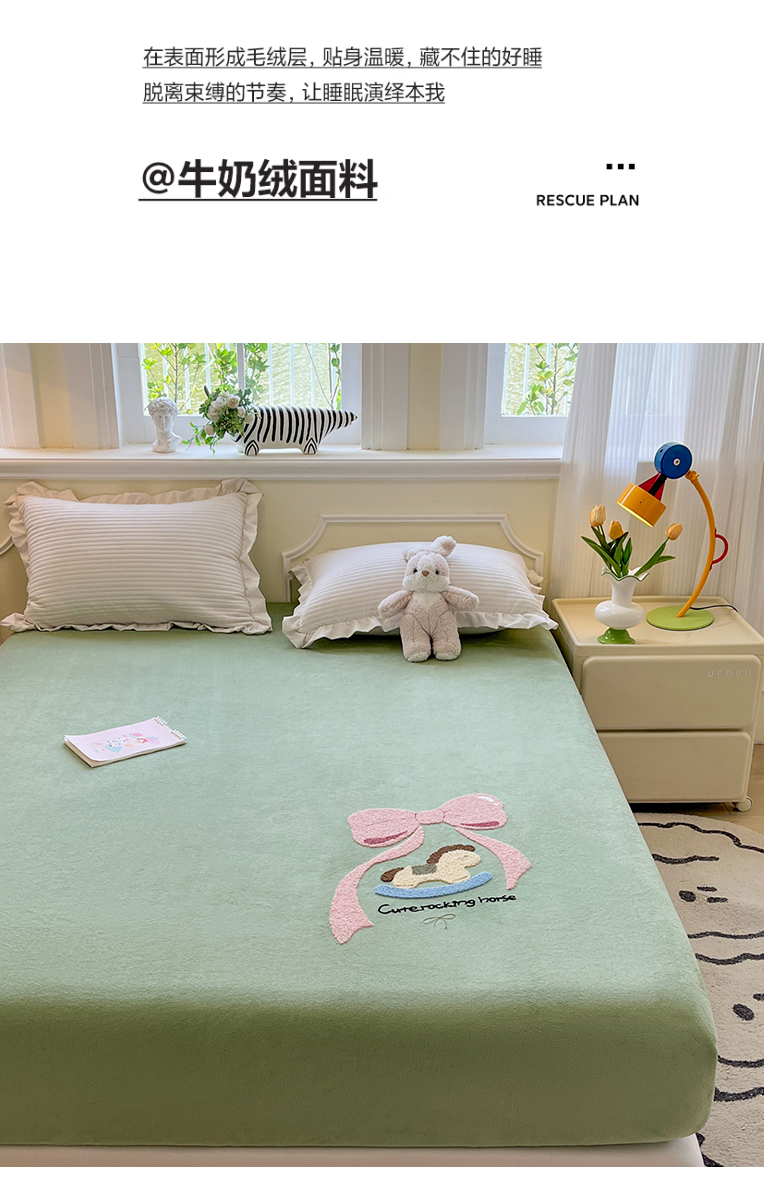 子钦家纺 2025秋冬新款加厚牛奶绒毛巾绣床笠 小马蝴蝶结-豆绿