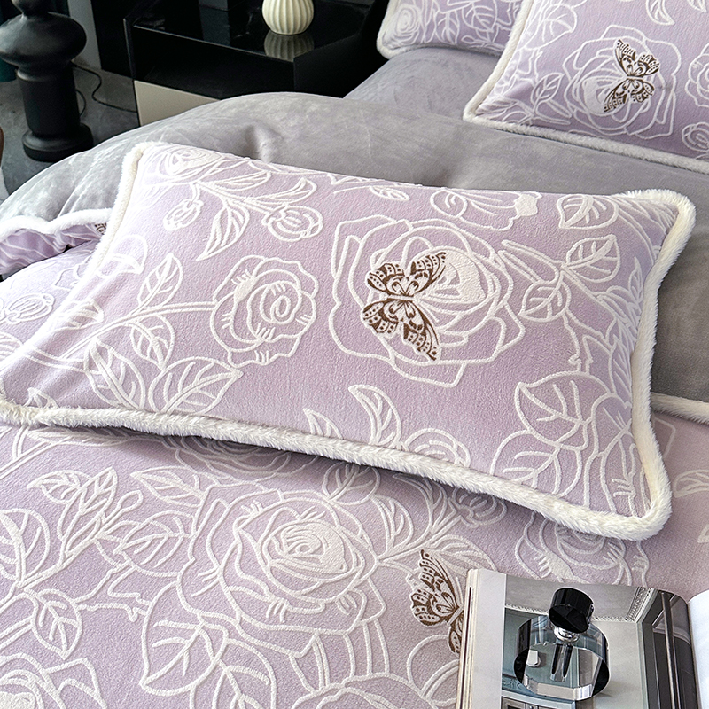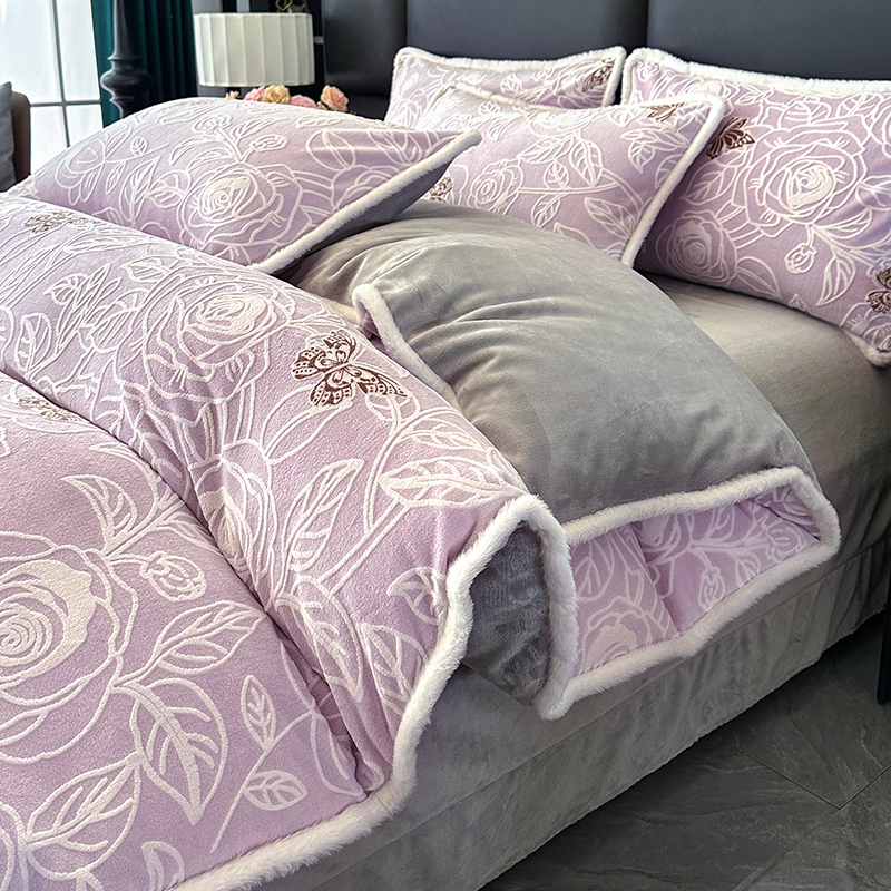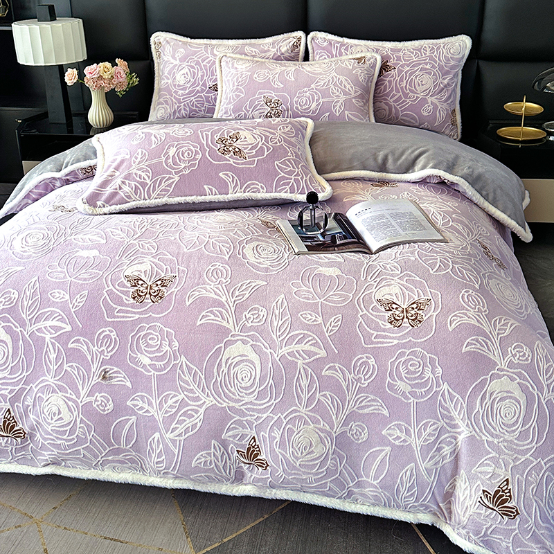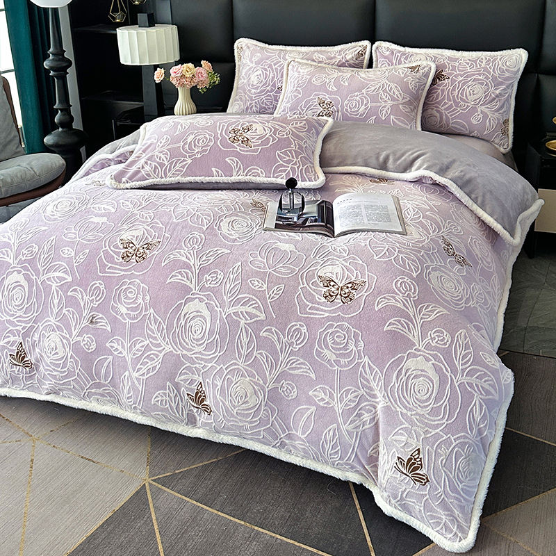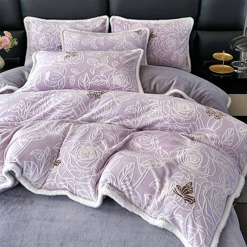 (总)柏薇 2025新款高克重牛奶绒绣花床盖四件套-缪系列,豆沙色,粉色,灰色,梦幻紫,奶蓝色,清新绿