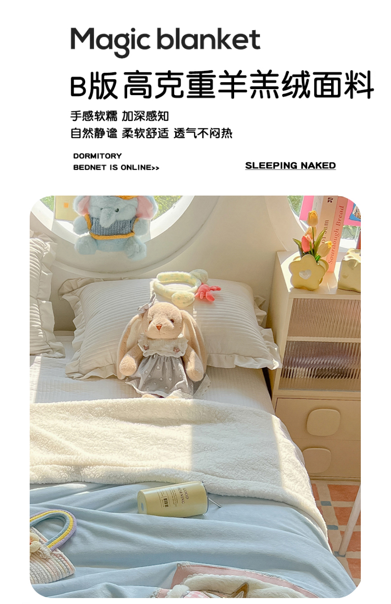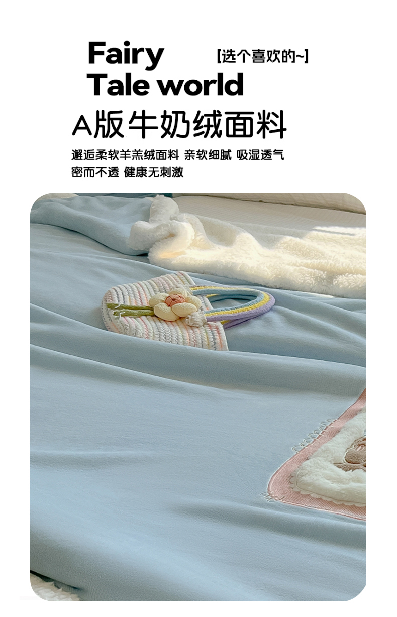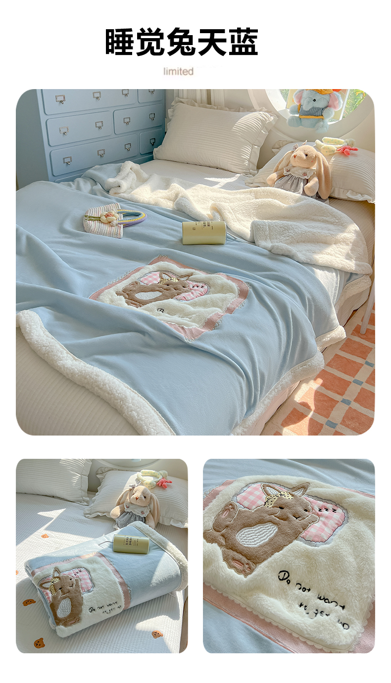 商品名称:子钦家纺 2025新款秋冬加厚牛奶绒羊羔绒卡通贴布绣包边毛毯(第二波) 睡觉兔-天蓝