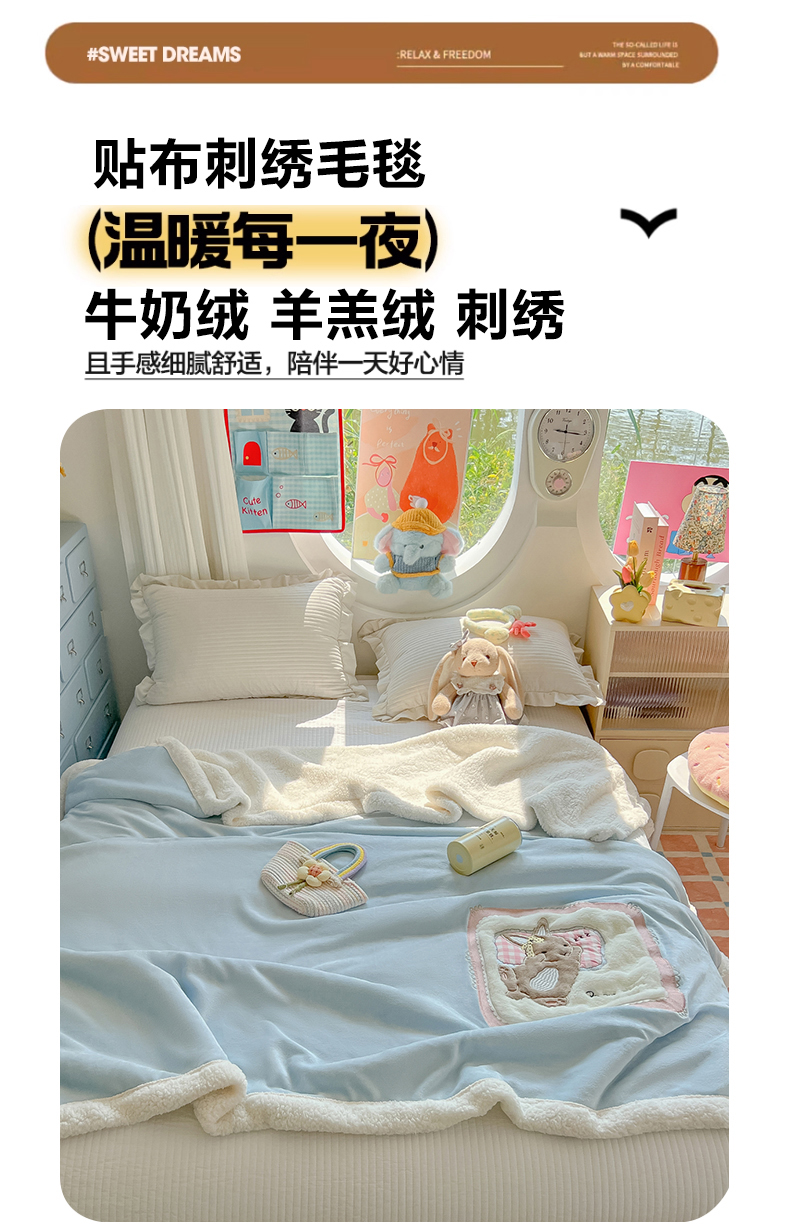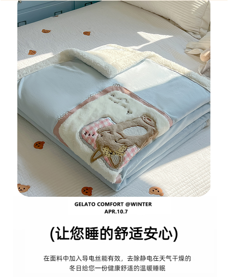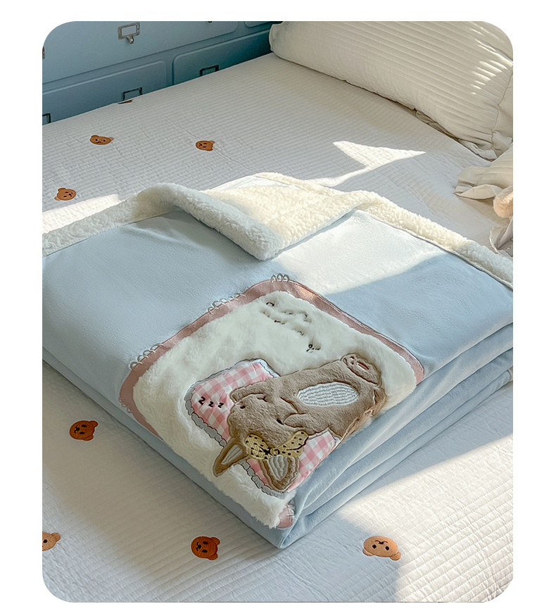子钦家纺 2025新款秋冬加厚牛奶绒羊羔绒卡通贴布绣包边毛毯(第二波) 睡觉兔-天蓝