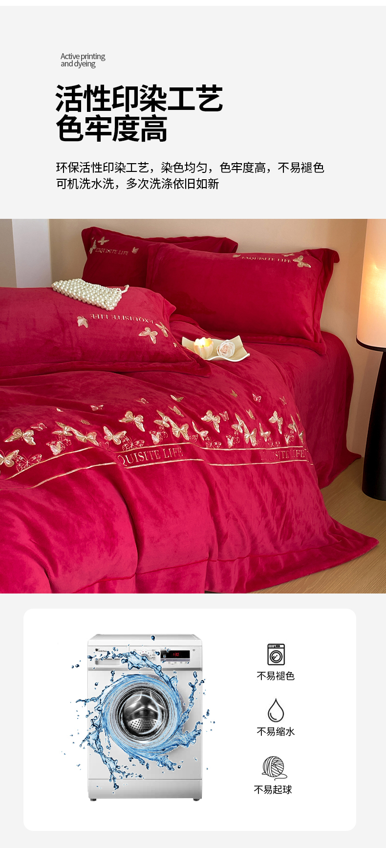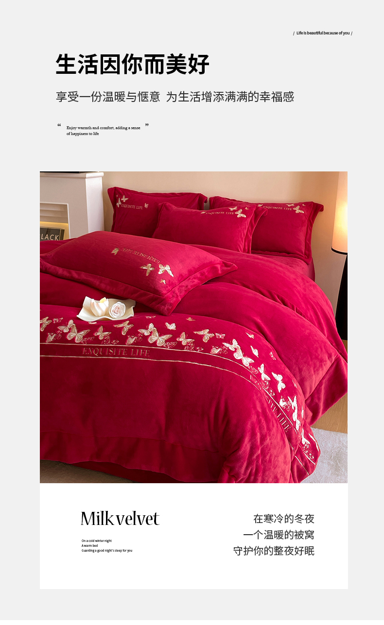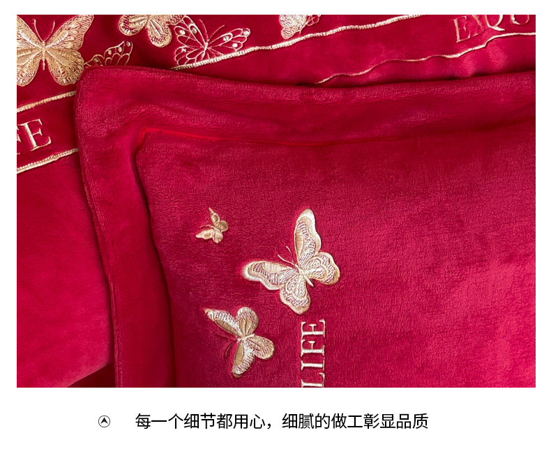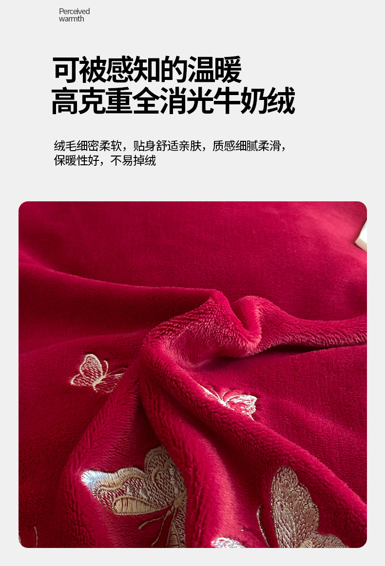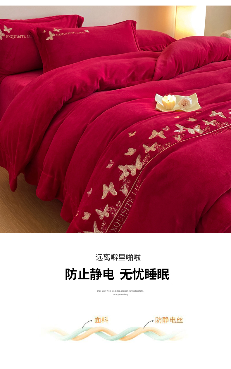 当前位置: 91家纺网 > 商品网购 > 床品套件 > 四件套 > 牛奶绒四件套 > 新方向 2025新款全消光A类刺绣牛奶绒四件套-婚庆红色系列 蝶舞-洋酒红