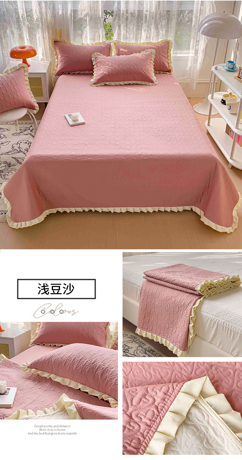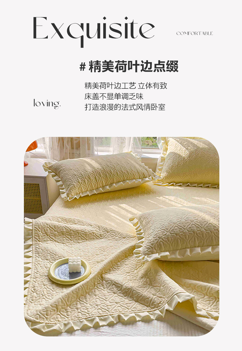 • 91家纺网 家纺一手货源 找家纺 (总)妮可 2025新款荷叶边纯棉绗缝四季款多功能床盖,奶油黄,冰湖蓝,豆豆沙,梦幻粉,气质灰,森林绿,芝兰紫