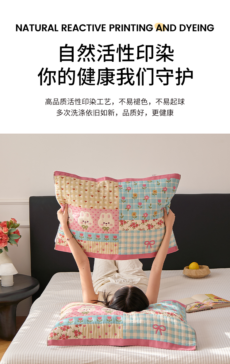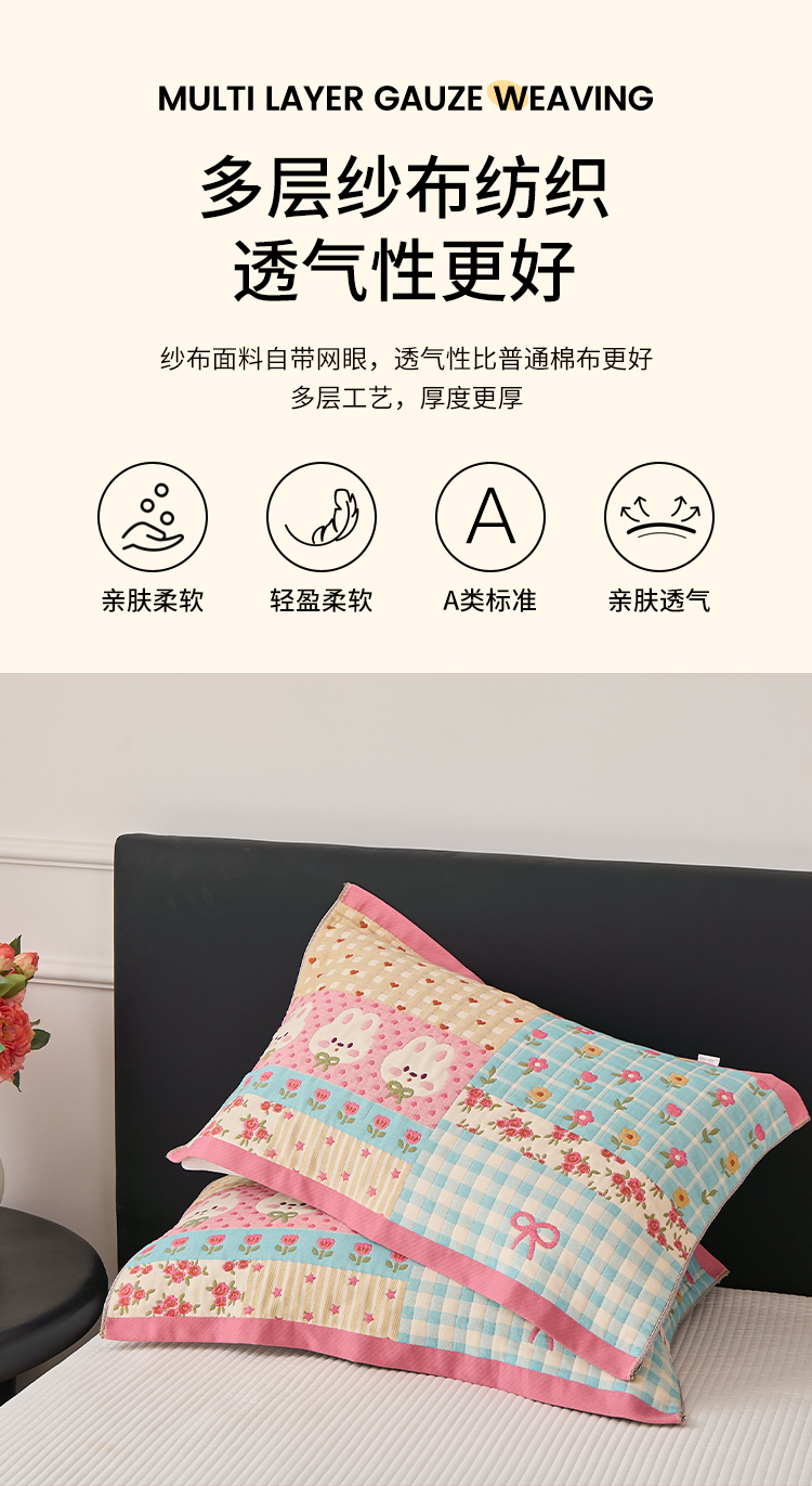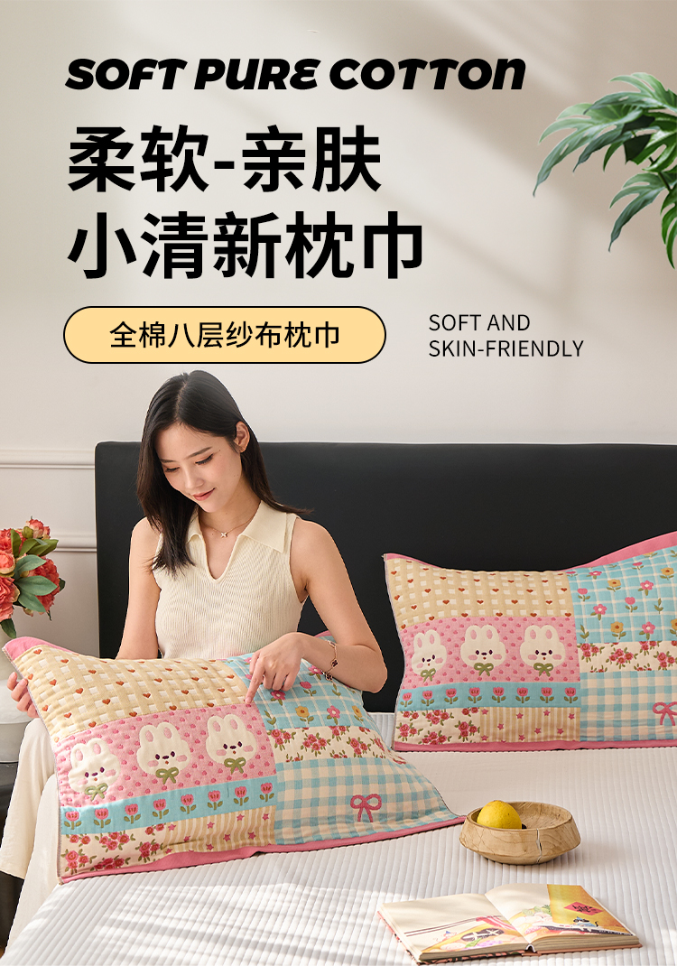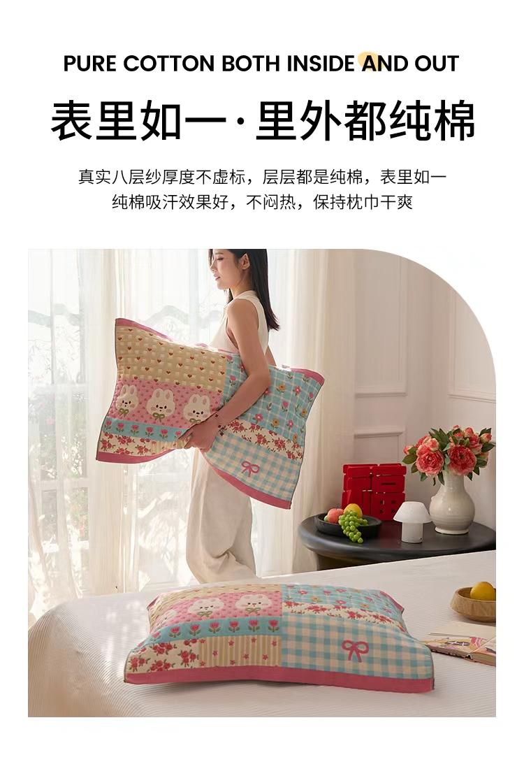 沐瑟家纺 2025新款纯棉纱布枕巾八层枕巾-發 小花兔