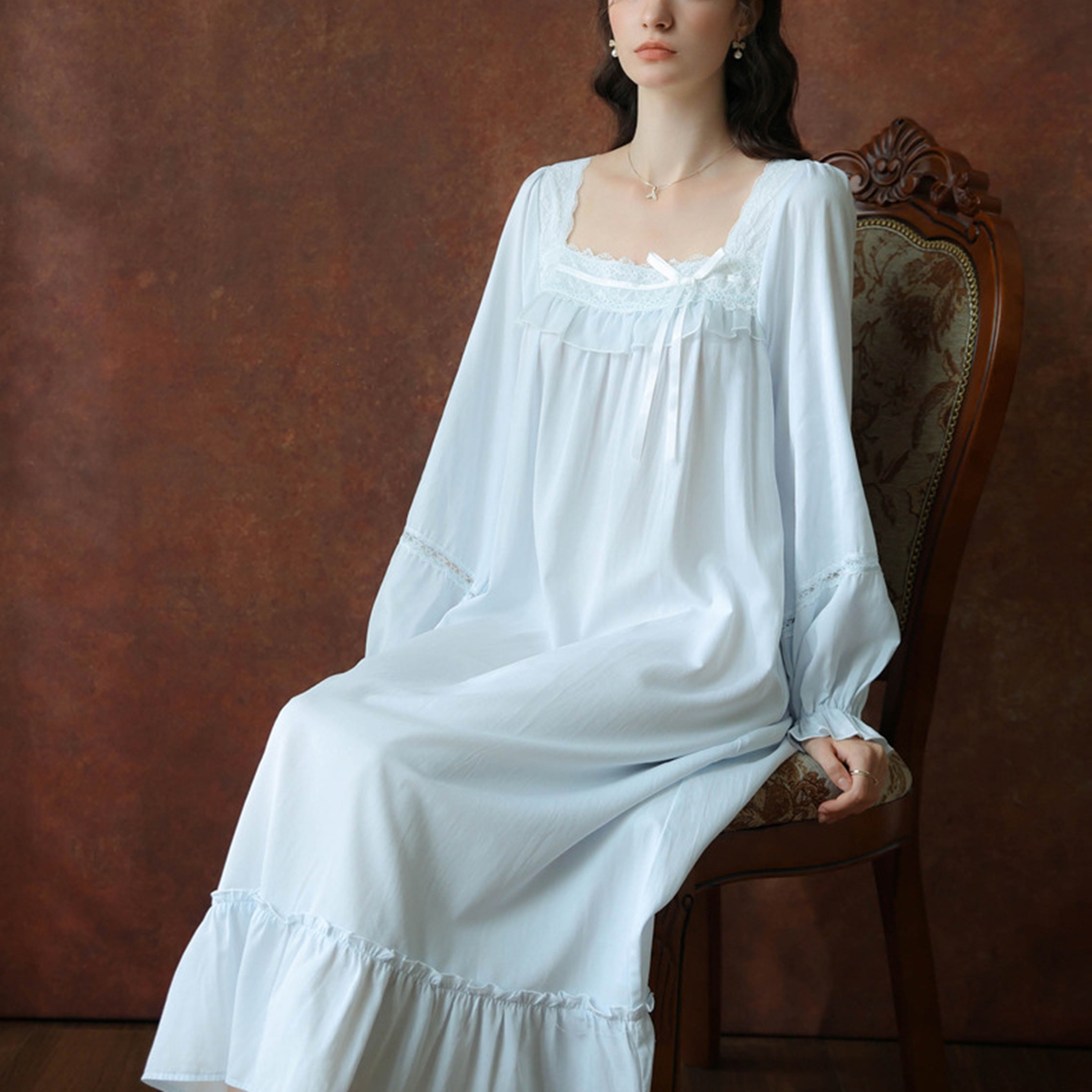 洛兰沙家居馆 2026新款长袖睡裙宫廷风甜美公主法式复古宽松圆领新款女春秋针织棉睡衣 黄色