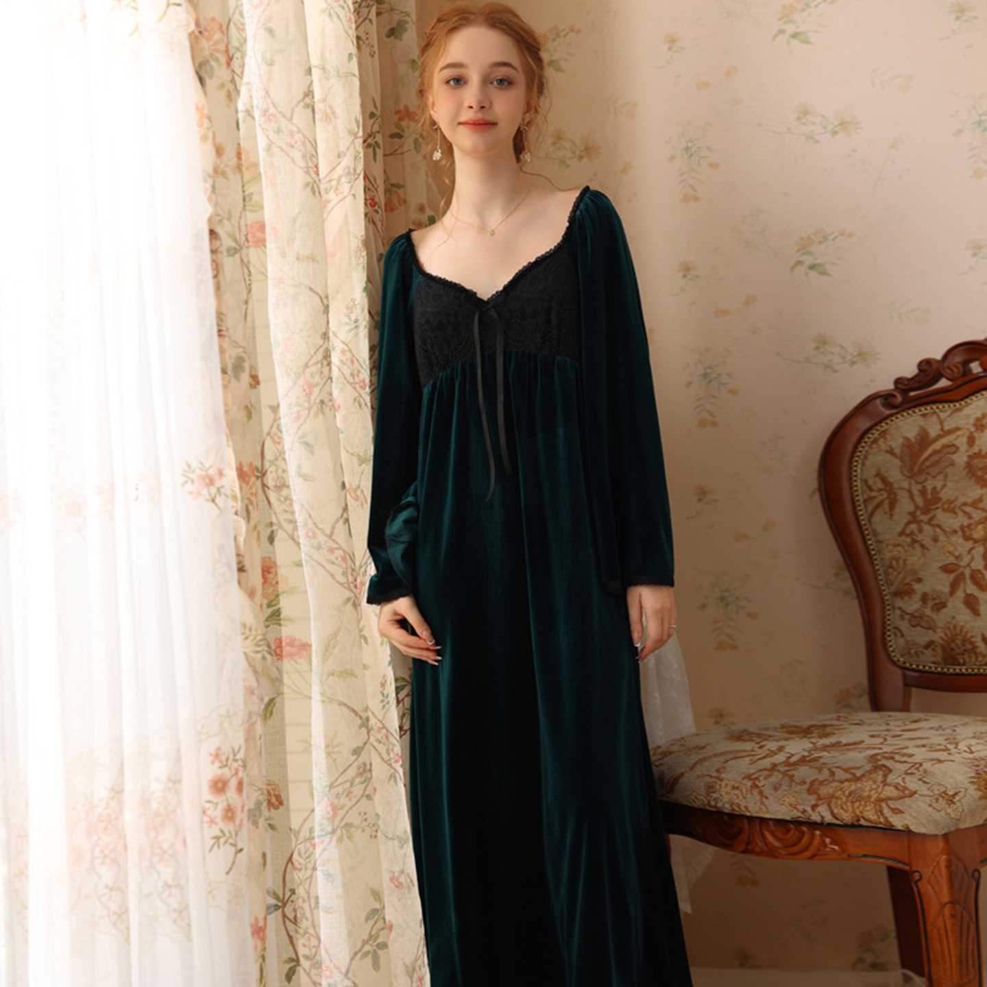 商品名称:洛兰沙家居馆 2026新款秋冬宽松复古宫廷绒款V领睡裙睡袍长袖长款公主保暖家居服绒睡衣 绿色