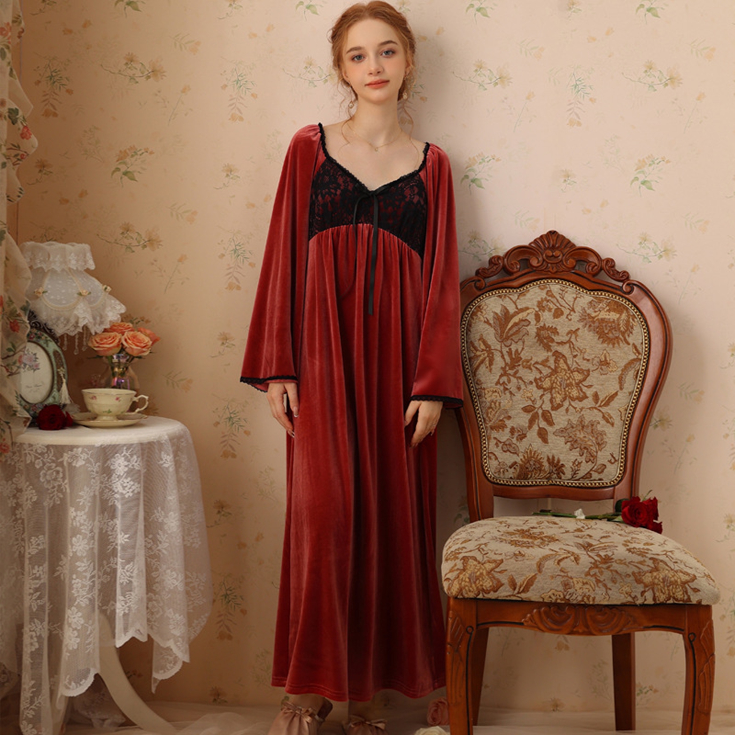 洛兰沙家居馆 2026新款秋冬宽松复古宫廷绒款V领睡裙睡袍长袖长款公主保暖家居服绒睡衣 绿色