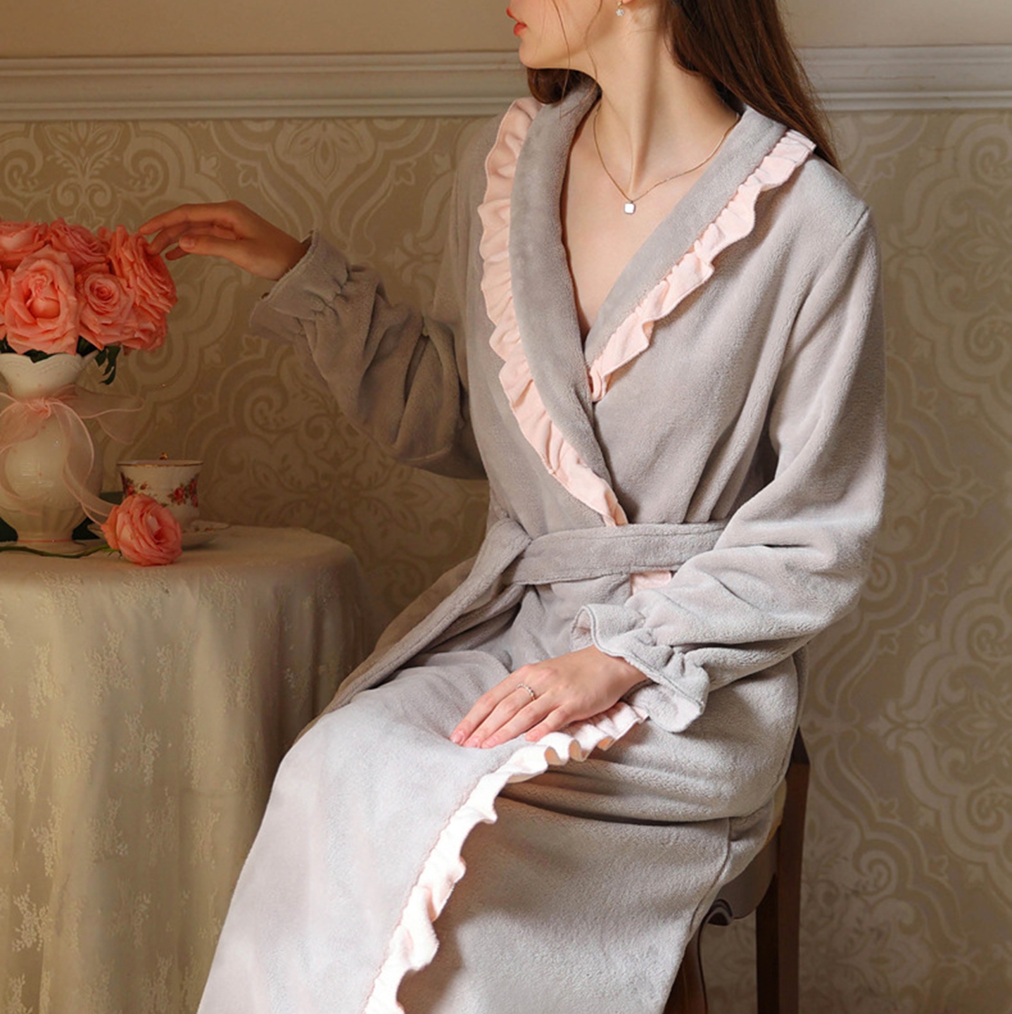 商品名称:洛兰沙家居馆 2026新款秋冬宽松复古宫廷绒睡袍少女厚长袖长款公主加厚保暖家居服绒睡衣 粉色