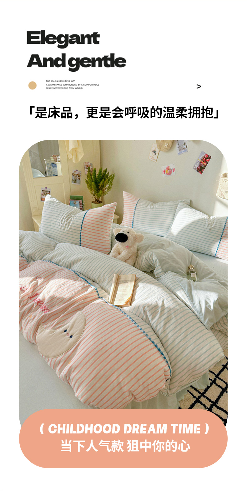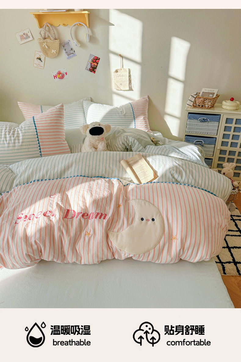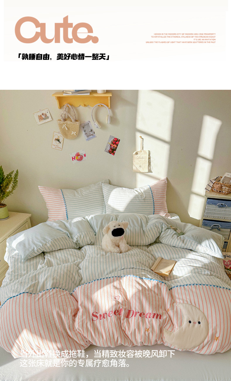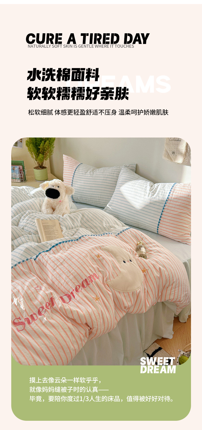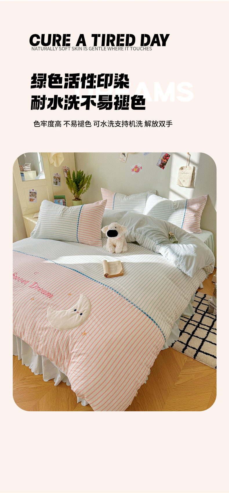 当前位置: 91家纺网 > 商品网购 > 床品套件 > 四件套 > 水洗棉四件套 > 贝凯瑞 2026款仿棉木棉水洗棉绣花ins小清新床裙床单款四件套-星月语 星月语-雾粉冰蓝