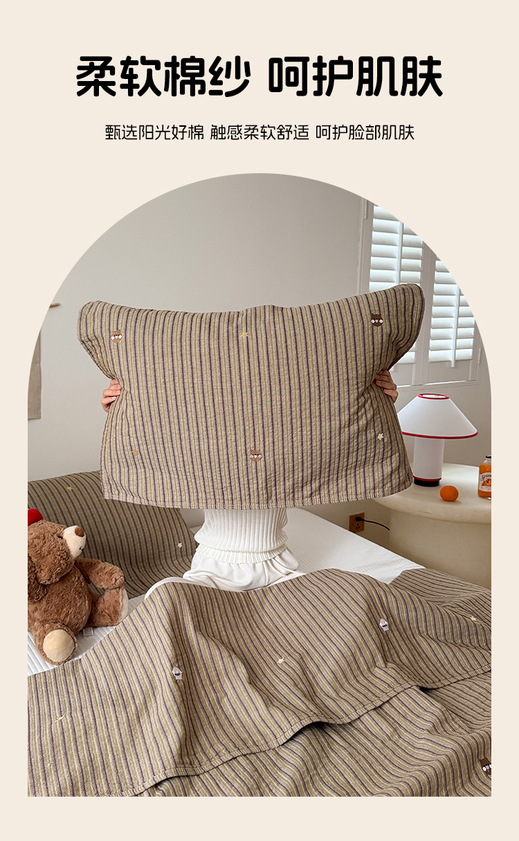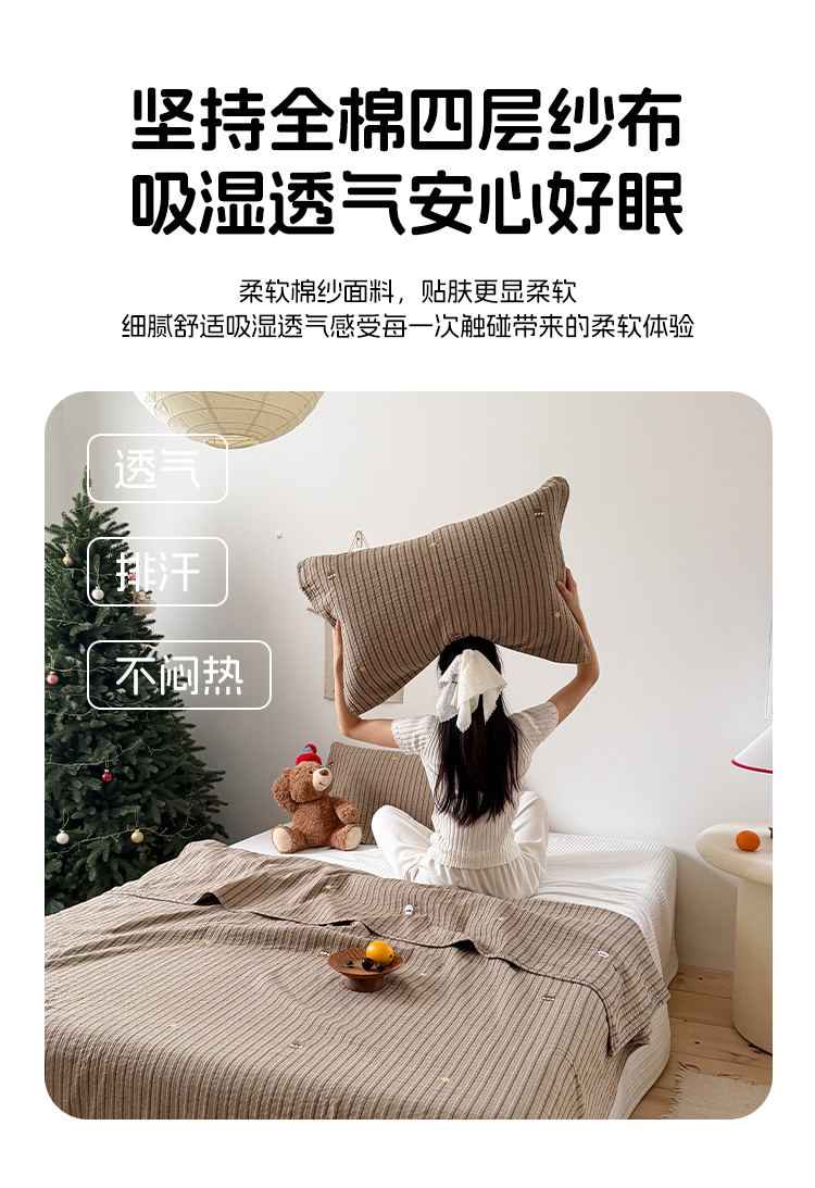 (总)沐瑟家纺 2025新款简约风多功能纱布盖毯纱布毯子毛巾被床盖沙发巾单毯枕巾枕套三件套,H本色,H橙色,H咖色,大马士革本色
