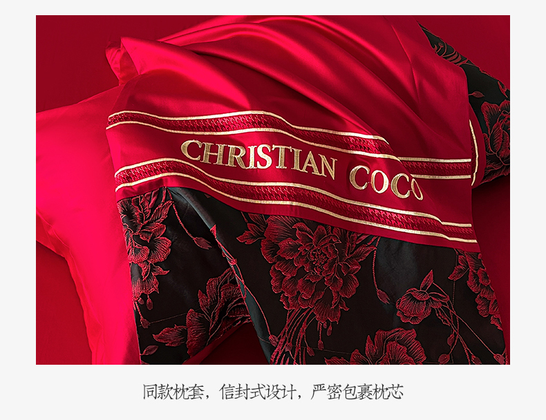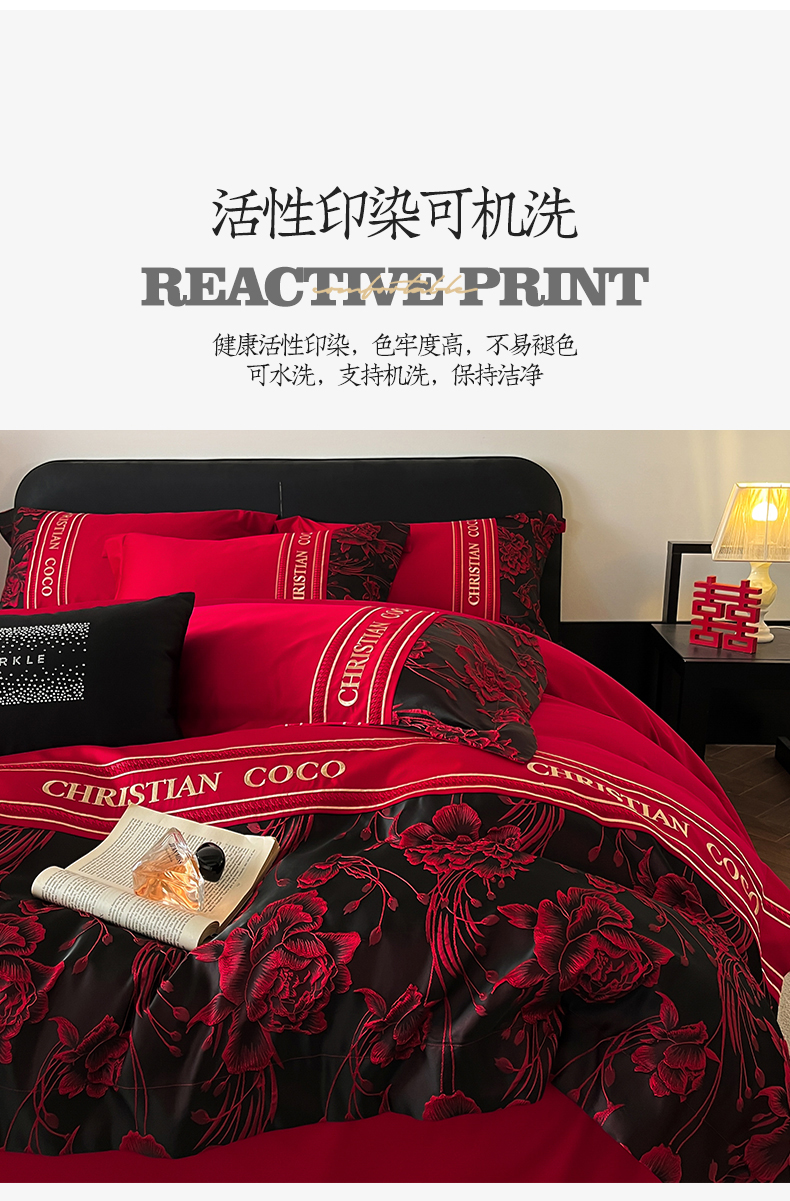 置顶家纺 2026新款爱意亲肤提花刺绣婚庆系列四件套 爱意-大红