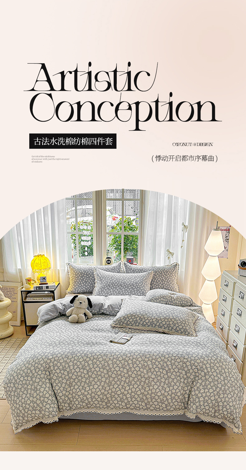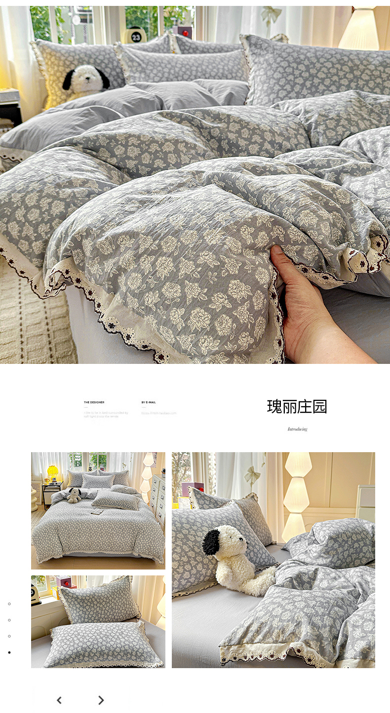 当前位置: 91家纺网 > 商品网购 > 床品套件 > 四件套 > 全棉普通四件套 > 韩秀家纺 2026新款A类纺棉四件套全棉花边古法水洗棉法式蕾丝花边四件套 花街萌宠