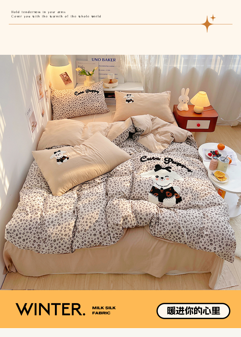 (总)炫拼家纺 2026新款A类棉麻刺绣卡通贝壳边四件套-布鲁系列,布鲁-小猫,布鲁-小熊,布鲁-小狗,布鲁-小马