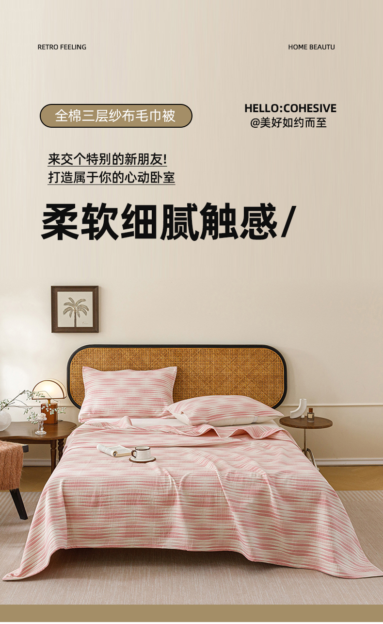 商品名称:悦然毛巾被 2026新款条纹全棉纯棉色织三层纱毛巾被休闲盖毯毯子 竹影粉