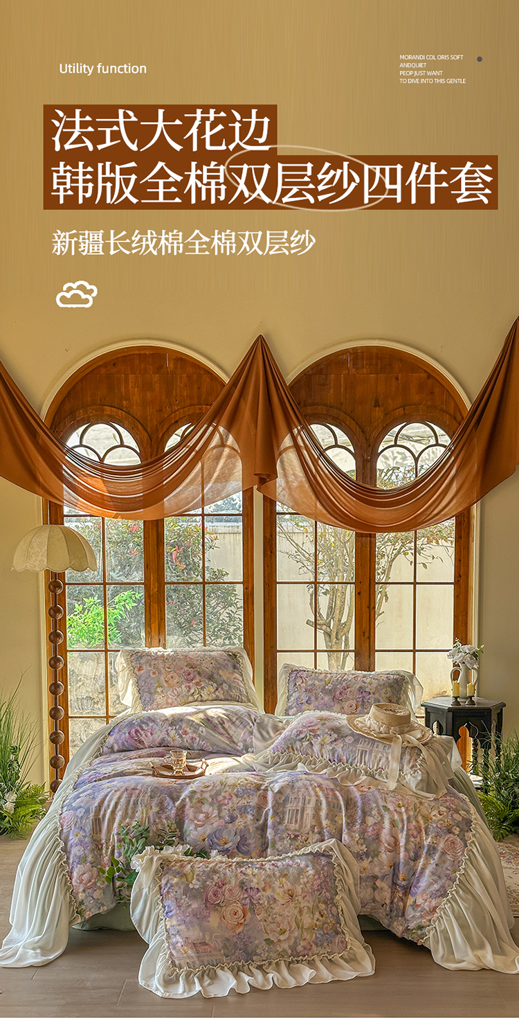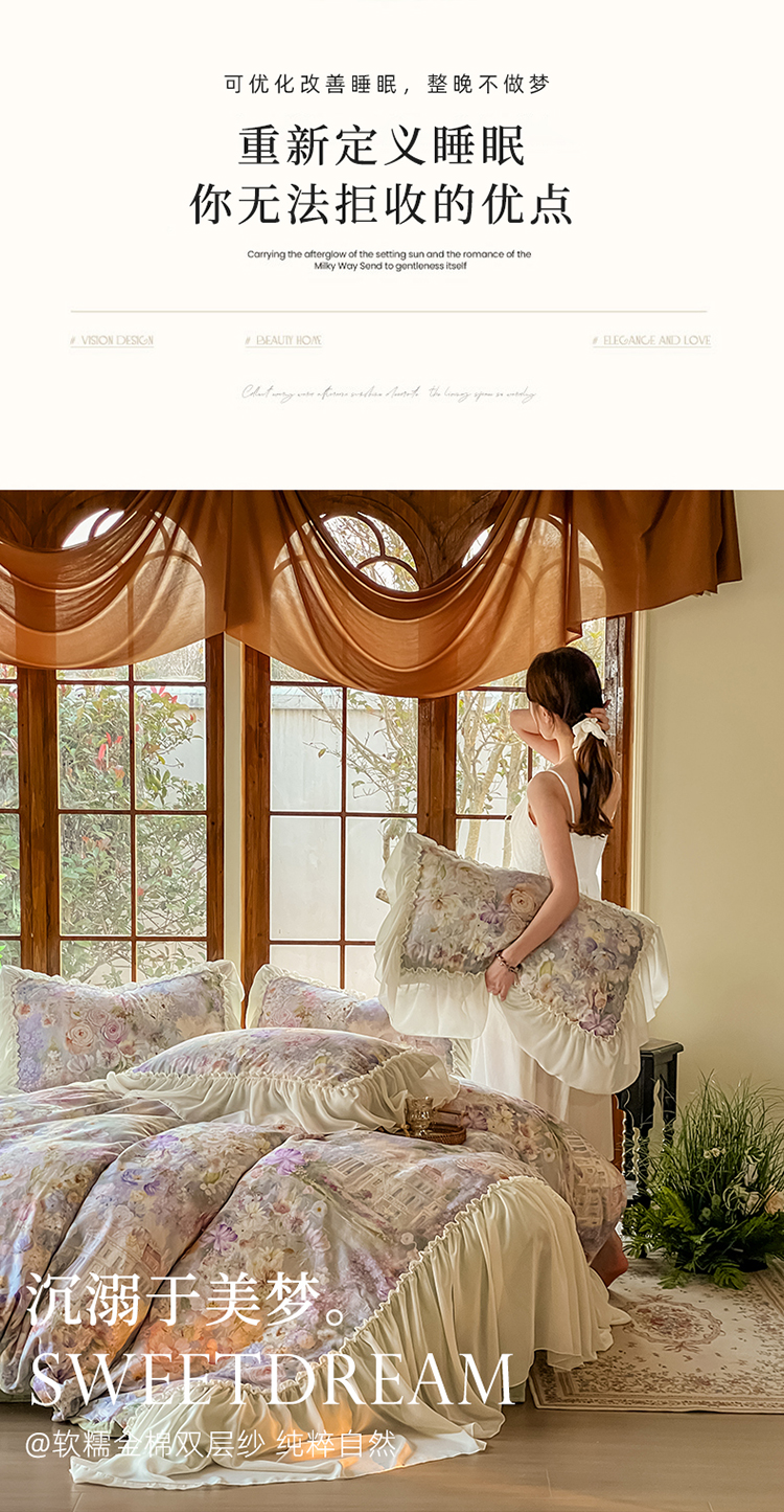 (总)【苏东来】2026高端韩版法式花边纯棉全棉双层纱四件套复古赫本公主风浪漫荷叶边花卉纯棉四件套被套床单,青黛,芳菲,花隐,拾光里里,木槿,蔷薇恋人,虞美人,疏影,暮色玫瑰,爱丽丝
